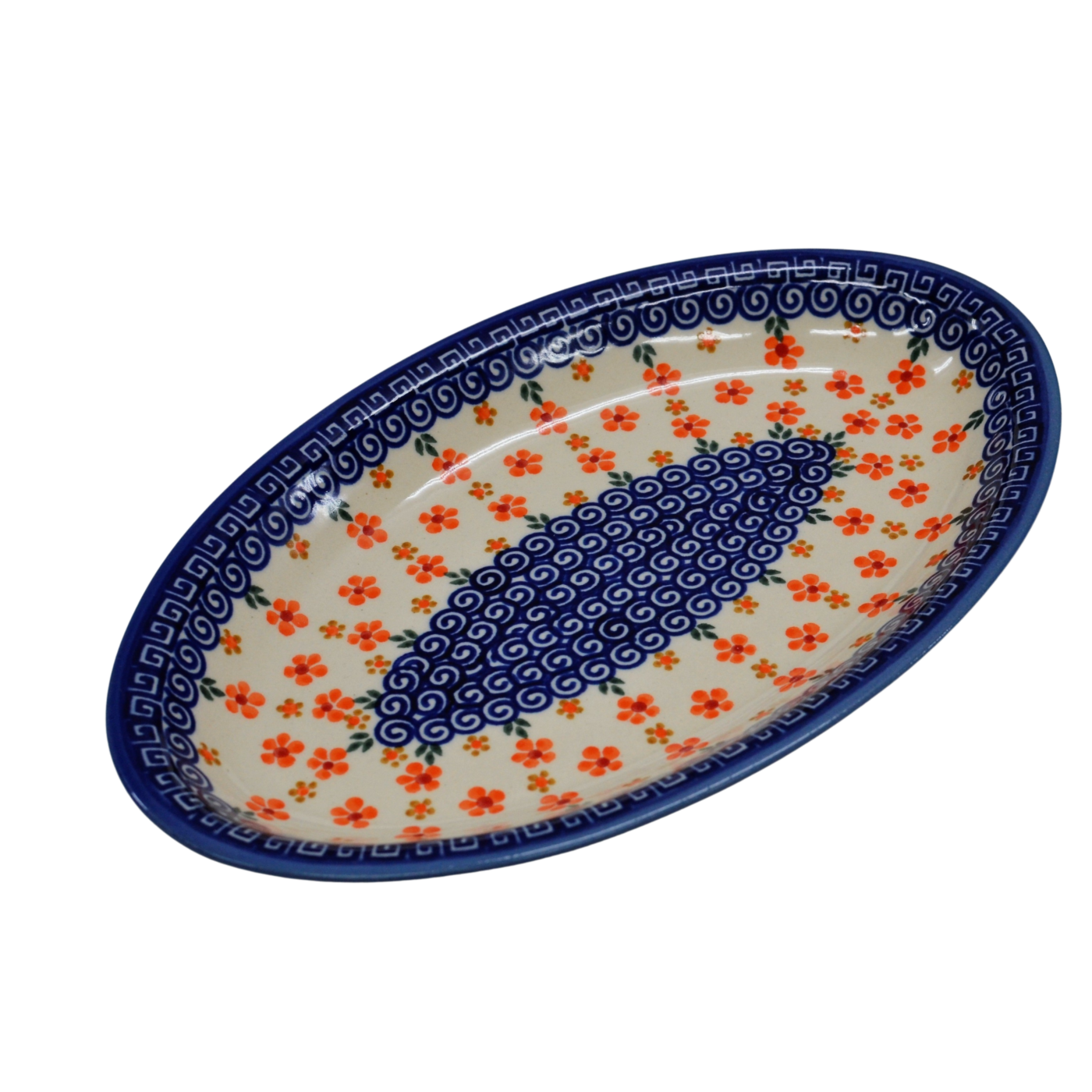 Półmisek salaterka na przystawki AMADEUS o 27 cm długości, ręcznie wykonany w bolesławieckiej manufakturze ceramiki artystycznej. Idealne naczynie ceramiczne do podawania potraw obiadowych, przystawek a nawet jako pojedyncze naczynie do podania obiadu (jako talerz).
