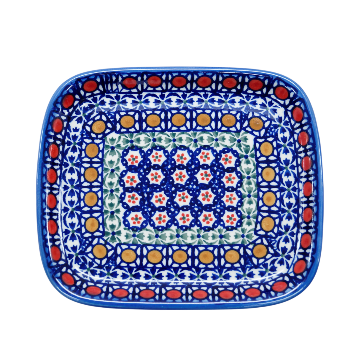 Oryginalny produkt ceramiki bolesławieckiej ręcznie wykonanej w tradycyjny sposób w manufakturze ceramiki artystycznej, ANDY CERAMIKA - ceramiczny półmisek - talerz prostokątny, ręcznie dekorowany podszkliwnie, naczynie do serwowania i przechowywania.