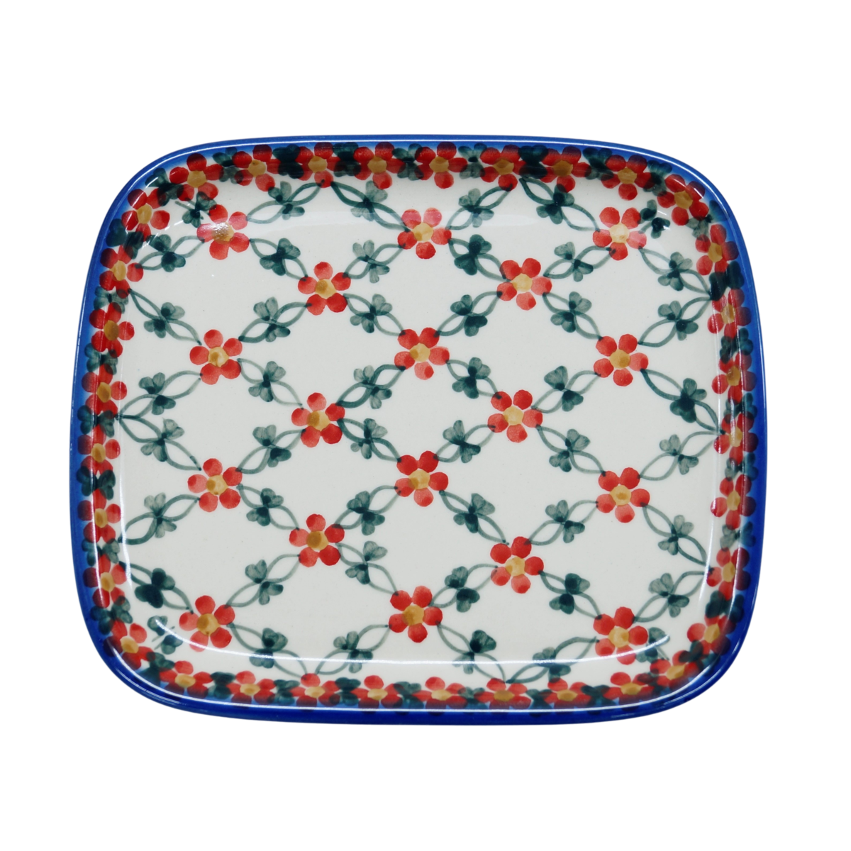 Oryginalny produkt ceramiki bolesławieckiej ręcznie wykonanej w tradycyjny sposób w manufakturze ceramiki artystycznej, ANDY CERAMIKA - ceramiczny półmisek - talerz prostokątny, ręcznie dekorowany podszkliwnie, naczynie do serwowania i przechowywania.