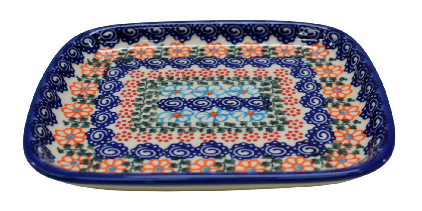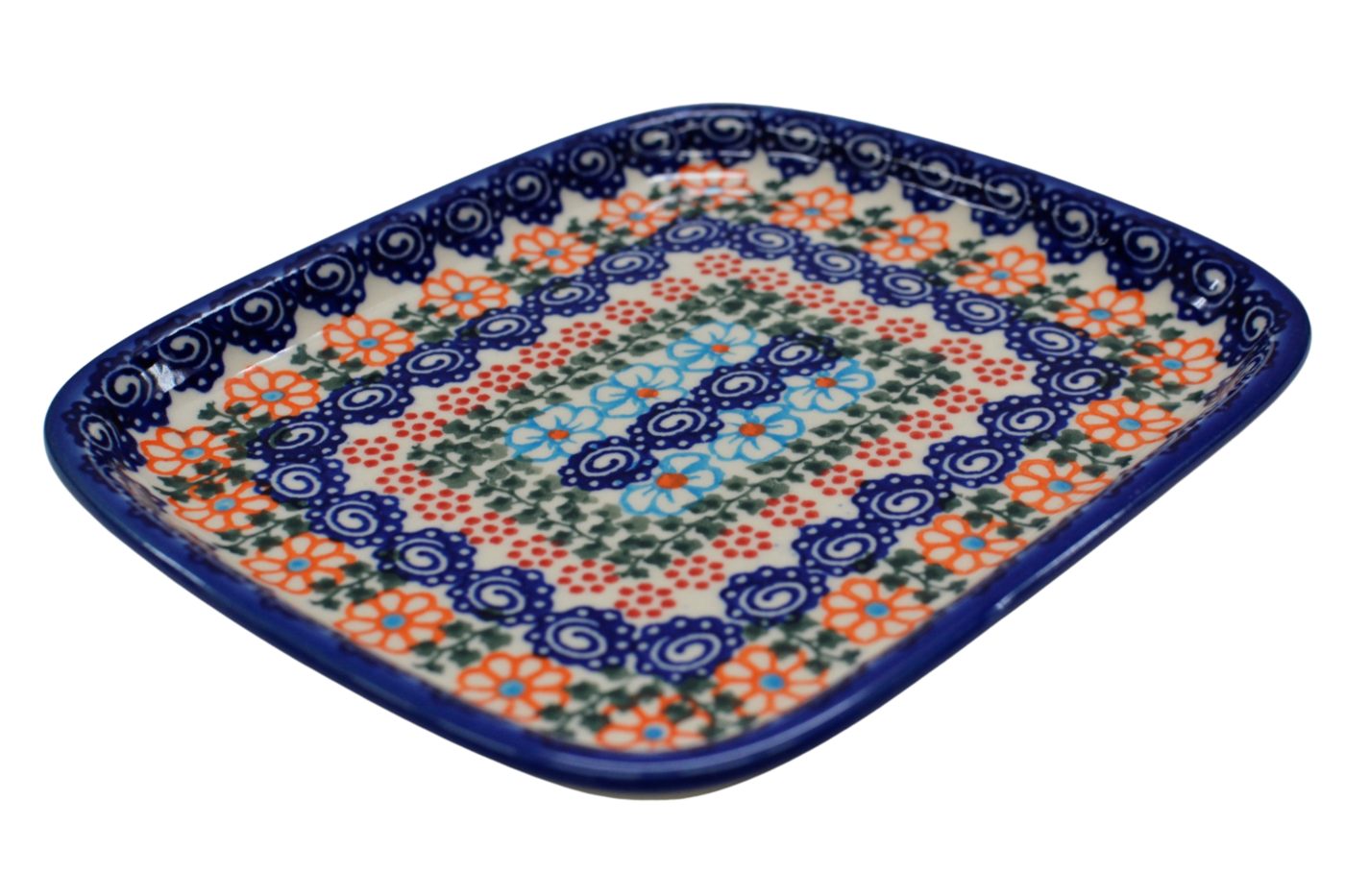 Oryginalny produkt ceramiki bolesławieckiej ręcznie wykonanej w tradycyjny sposób w manufakturze ceramiki artystycznej, ANDY CERAMIKA - ceramiczny półmisek - talerz prostokątny, ręcznie dekorowany podszkliwnie, naczynie do serwowania i przechowywania.