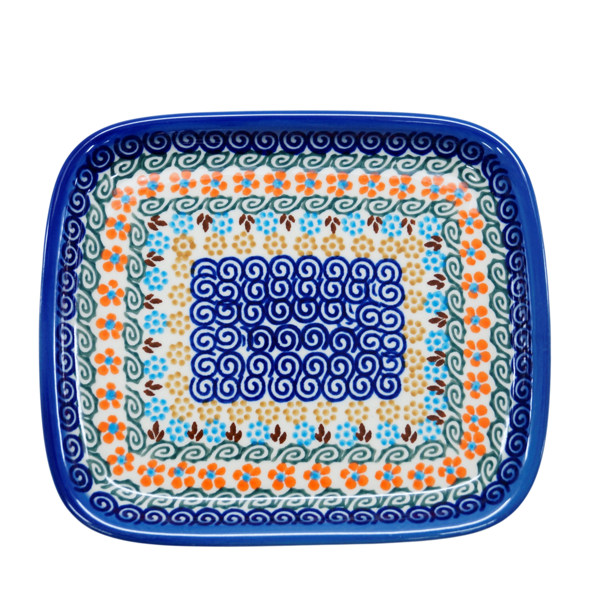 Oryginalny produkt ceramiki bolesławieckiej ręcznie wykonanej w tradycyjny sposób w manufakturze ceramiki artystycznej, ANDY CERAMIKA - ceramiczny półmisek - talerz prostokątny, ręcznie dekorowany podszkliwnie, naczynie do serwowania i przechowywania.