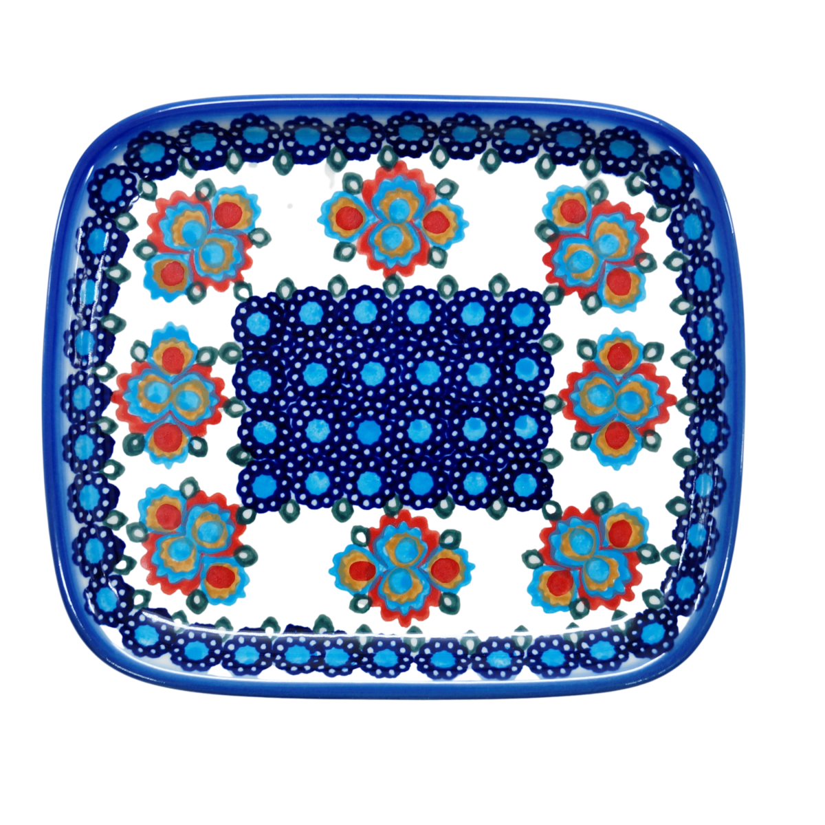 Oryginalny produkt ceramiki bolesławieckiej ręcznie wykonanej w tradycyjny sposób w manufakturze ceramiki artystycznej, ANDY CERAMIKA - ceramiczny półmisek - talerz prostokątny, ręcznie dekorowany podszkliwnie, naczynie do serwowania i przechowywania.