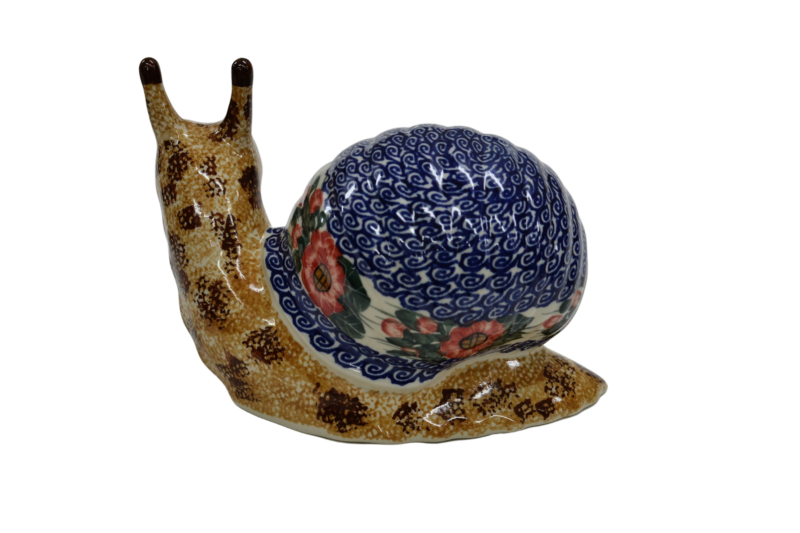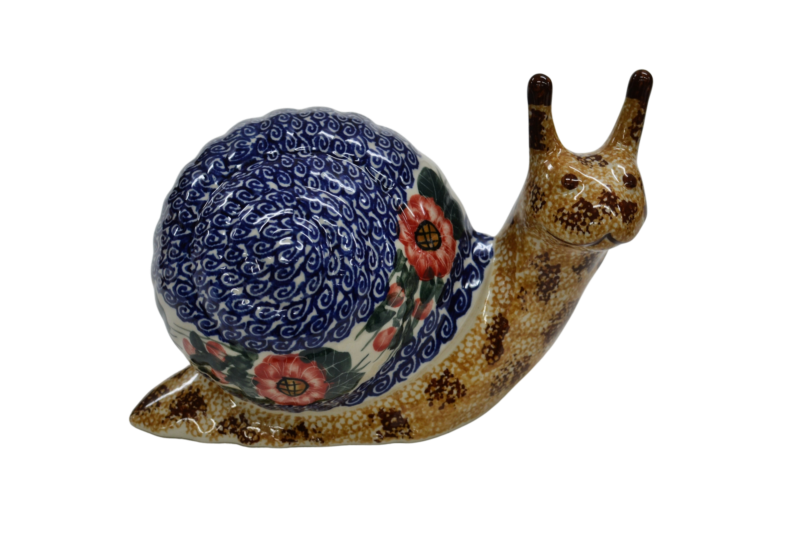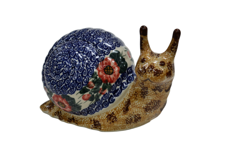 Ceramiczny ślimak dekoracyjny, wykonany w bolesławieckiej manufakturze ceramiki artystycznej. Pięknie dekorowany ślimak, który idealne nadaje się do dekoracji domowych ogródków i domów.