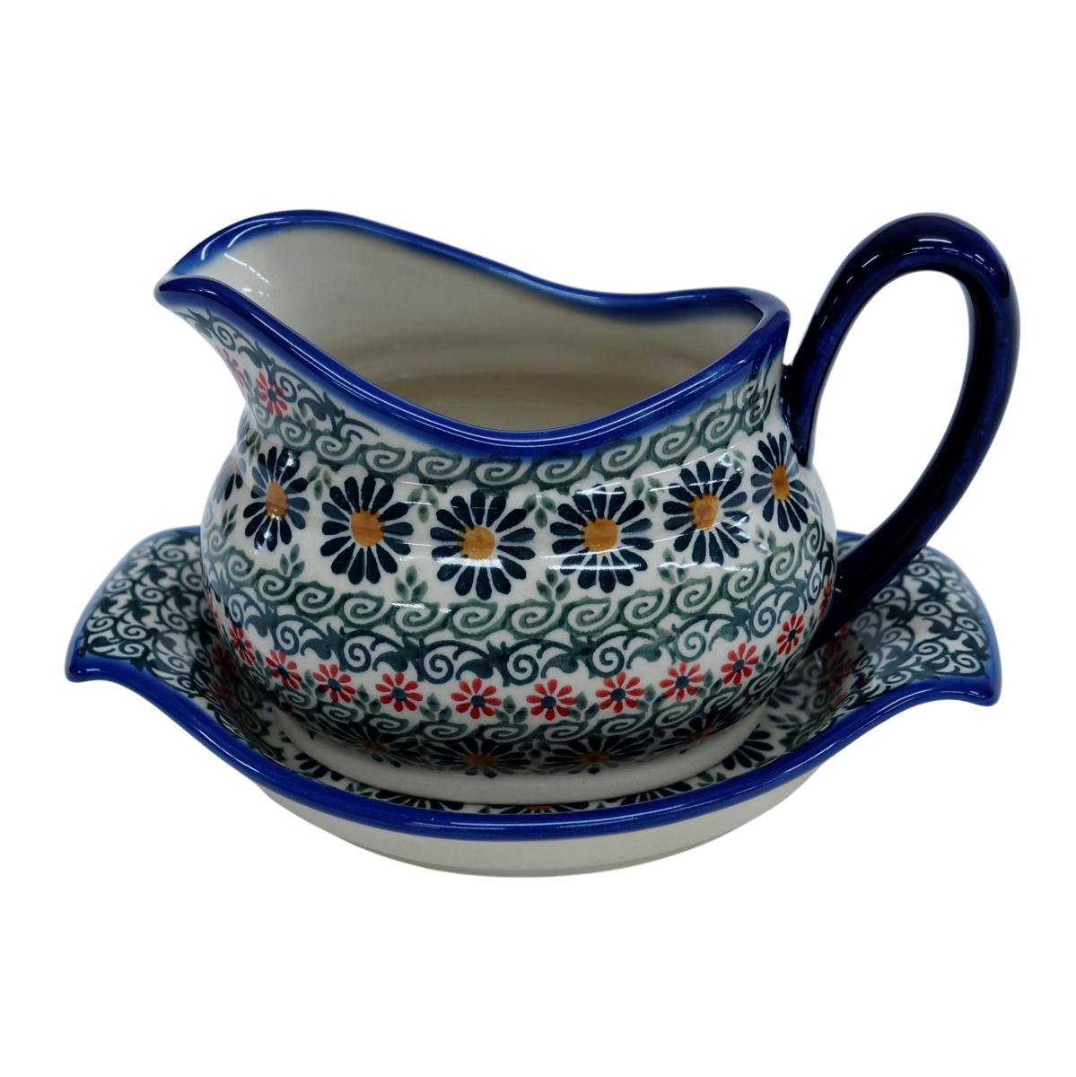 Sosjerka z podstawką z Bolesławca z fabryki ceramiki, ANDY CERAMIKA. Sosjerka ceramiczna to podstawowe wyposażenie kuchni, które przydaje się niemal codziennie do podawania różnego rodzaju sosów. Subtelna sosjerka z rączką podkreśla charakter podania sosu a podstawka chroni obrus przed zabrudzeniem. Warto dołączyć do niej chochelkę aby móc łatwiej rozlewać sos na talerze bądź nalewać sos bezpośrednio ze sosjerki. Ręcznie malowana sosjerka z ceramiki o praktycznym zastosowaniu podczas serwowania posiłków.