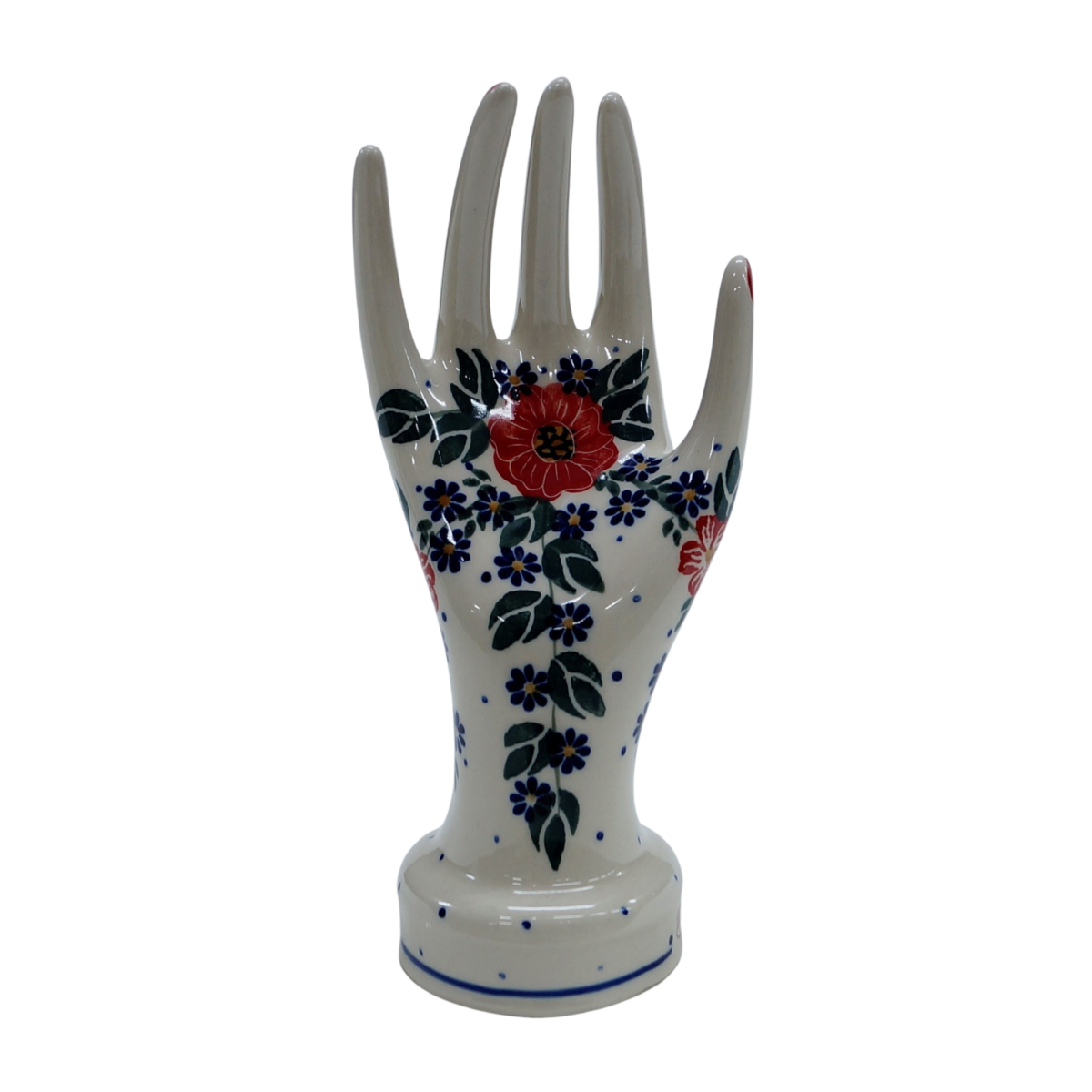 Ceramiczny stojak na biżuterię duży, w kształcie powabnej, damskiej dłoni ozdobionymi podszkliwnymi wzorami – niczym przyodziany w wyjątkowo śliczną rękawiczkę, to oryginalny i nieoceniony wieszak dla kobiecych świecidełek. Rewelacyjnie wyglądający dodatek dekoracyjny a zarazem funkcjonalny kobiecej toaletki jak i łazienki. Dzięki szkliwieniu, jest bardzo łatwy w utrzymaniu czystości. Zawieszona na nim biżuteria taka jak, łańcuszki, kolczyki czy pierścionki będą zawsze pod ręką, ułożone w piękny sposób.