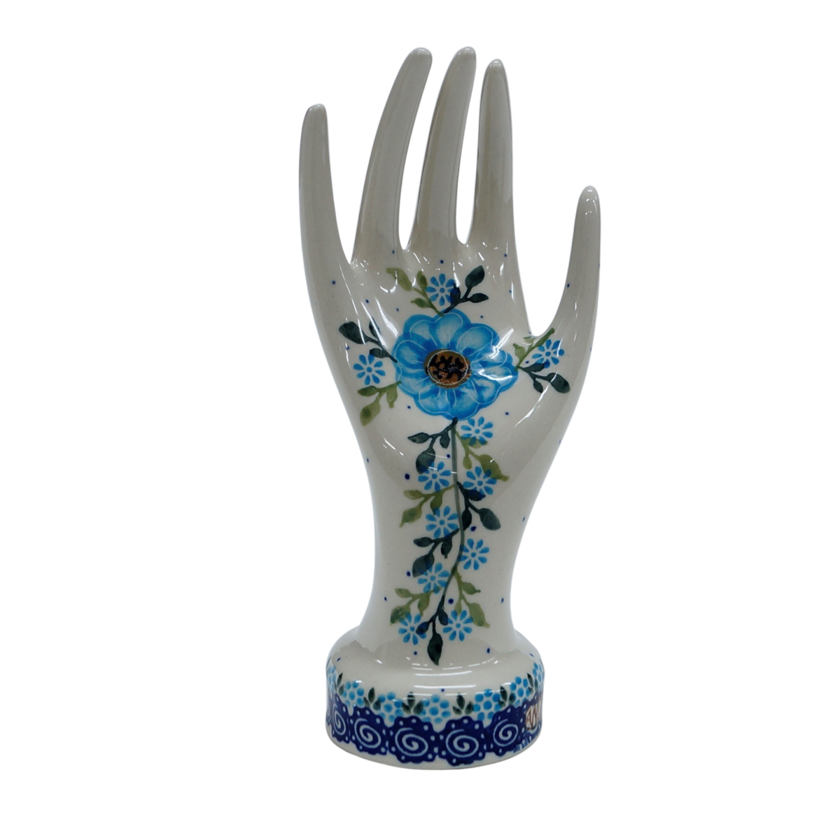 Ceramiczny stojak na biżuterię duży, w kształcie powabnej, damskiej dłoni ozdobionymi podszkliwnymi wzorami – niczym przyodziany w wyjątkowo śliczną rękawiczkę, to oryginalny i nieoceniony wieszak dla kobiecych świecidełek. Rewelacyjnie wyglądający dodatek dekoracyjny a zarazem funkcjonalny kobiecej toaletki jak i łazienki. Dzięki szkliwieniu, jest bardzo łatwy w utrzymaniu czystości. Zawieszona na nim biżuteria taka jak, łańcuszki, kolczyki czy pierścionki będą zawsze pod ręką, ułożone w piękny sposób.