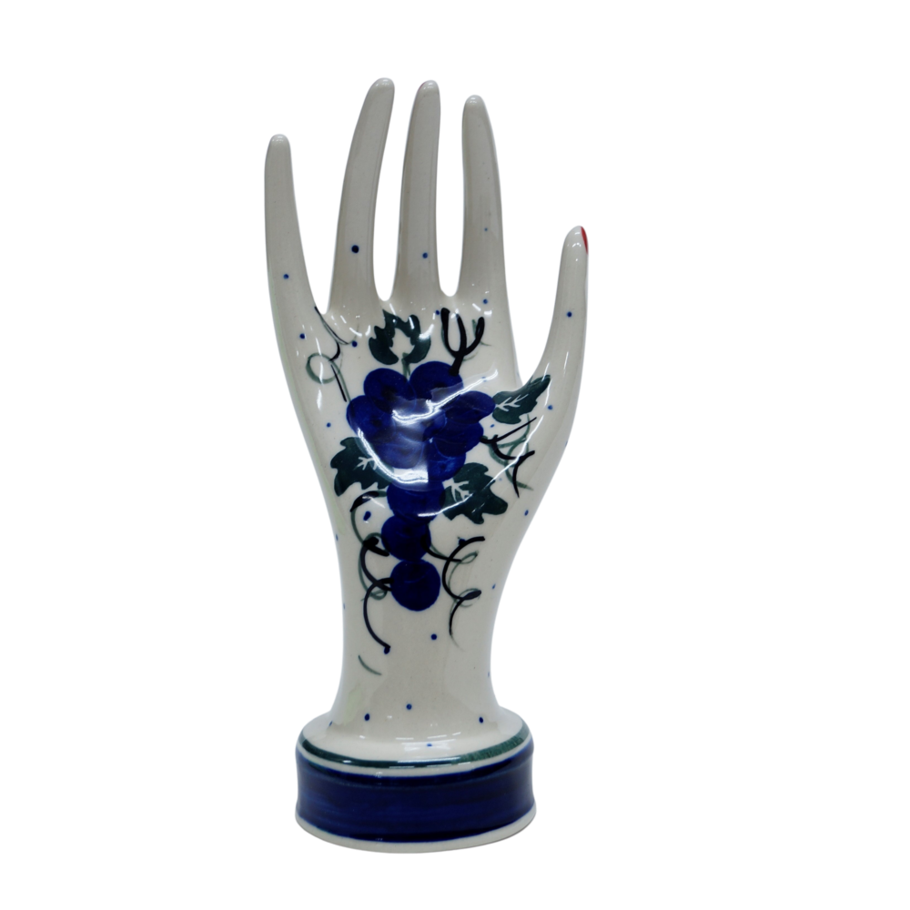Ceramiczny stojak na biżuterię duży, w kształcie powabnej, damskiej dłoni ozdobionymi podszkliwnymi wzorami – niczym przyodziany w wyjątkowo śliczną rękawiczkę, to oryginalny i nieoceniony wieszak dla kobiecych świecidełek. Rewelacyjnie wyglądający dodatek dekoracyjny a zarazem funkcjonalny kobiecej toaletki jak i łazienki. Dzięki szkliwieniu, jest bardzo łatwy w utrzymaniu czystości. Zawieszona na nim biżuteria taka jak, łańcuszki, kolczyki czy pierścionki będą zawsze pod ręką, ułożone w piękny sposób.