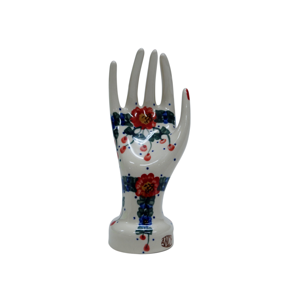 Ceramiczny stojak na biżuterię mały, w kształcie powabnej, damskiej dłoni ozdobionymi podszkliwnymi wzorami, prosto z Bolesławca – niczym przyodziany w wyjątkowo śliczną rękawiczkę, to oryginalny i nieoceniony wieszak dla kobiecych świecidełek. Rewelacyjnie wyglądający dodatek dekoracyjny a zarazem funkcjonalny kobiecej toaletki jak i łazienki, taki który pozwoli na zaprzestanie gubienia biżuterii w całym domu! Ahhh… skąd my to znamy! Dzięki szkliwieniu, jest bardzo łatwy w utrzymaniu czystości. Zawieszona na nim biżuteria taka jak, łańcuszki, kolczyki czy pierścionki będą zawsze pod ręką, ułożone w piękny sposób.