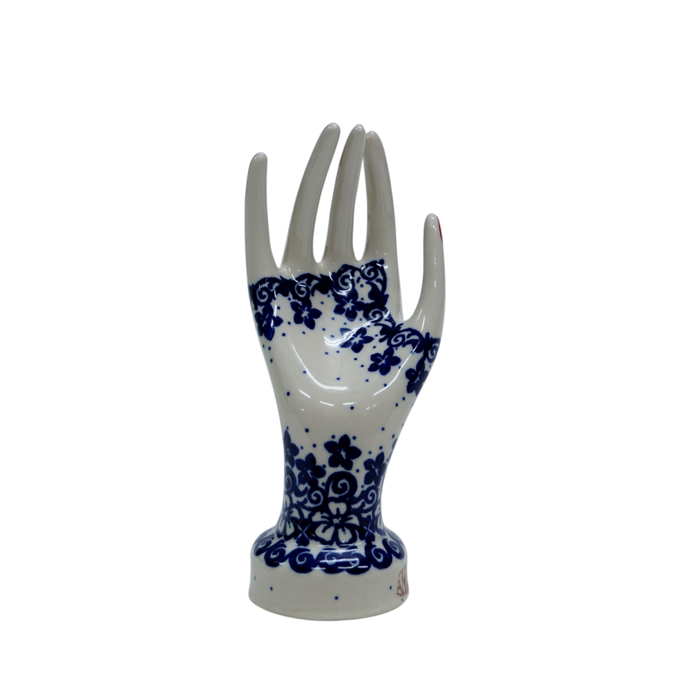 Ceramiczny stojak na biżuterię mały, w kształcie powabnej, damskiej dłoni ozdobionymi podszkliwnymi wzorami, prosto z Bolesławca – niczym przyodziany w wyjątkowo śliczną rękawiczkę, to oryginalny i nieoceniony wieszak dla kobiecych świecidełek. Rewelacyjnie wyglądający dodatek dekoracyjny a zarazem funkcjonalny kobiecej toaletki jak i łazienki, taki który pozwoli na zaprzestanie gubienia biżuterii w całym domu! Ahhh… skąd my to znamy! Dzięki szkliwieniu, jest bardzo łatwy w utrzymaniu czystości. Zawieszona na nim biżuteria taka jak, łańcuszki, kolczyki czy pierścionki będą zawsze pod ręką, ułożone w piękny sposób.