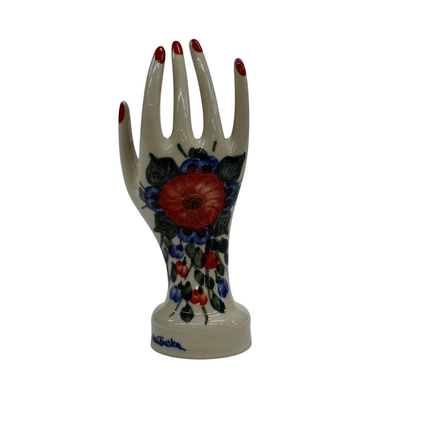 Ceramiczny stojak na biżuterię mały, w kształcie powabnej, damskiej dłoni ozdobionymi podszkliwnymi wzorami, prosto z Bolesławca – niczym przyodziany w wyjątkowo śliczną rękawiczkę, to oryginalny i nieoceniony wieszak dla kobiecych świecidełek. Rewelacyjnie wyglądający dodatek dekoracyjny a zarazem funkcjonalny kobiecej toaletki jak i łazienki, taki który pozwoli na zaprzestanie gubienia biżuterii w całym domu! Ahhh… skąd my to znamy! Dzięki szkliwieniu, jest bardzo łatwy w utrzymaniu czystości. Zawieszona na nim biżuteria taka jak, łańcuszki, kolczyki czy pierścionki będą zawsze pod ręką, ułożone w piękny sposób.