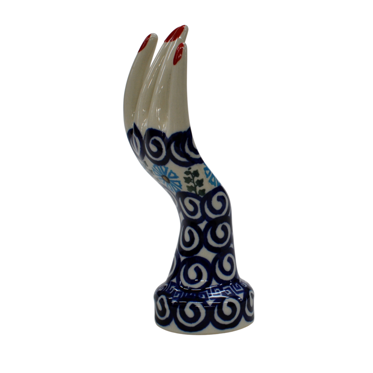 Ceramiczny stojak na biżuterię mały, w kształcie powabnej, damskiej dłoni ozdobionymi podszkliwnymi wzorami, prosto z Bolesławca – niczym przyodziany w wyjątkowo śliczną rękawiczkę, to oryginalny i nieoceniony wieszak dla kobiecych świecidełek. Rewelacyjnie wyglądający dodatek dekoracyjny a zarazem funkcjonalny kobiecej toaletki jak i łazienki, taki który pozwoli na zaprzestanie gubienia biżuterii w całym domu! Ahhh… skąd my to znamy! Dzięki szkliwieniu, jest bardzo łatwy w utrzymaniu czystości. Zawieszona na nim biżuteria taka jak, łańcuszki, kolczyki czy pierścionki będą zawsze pod ręką, ułożone w piękny sposób.