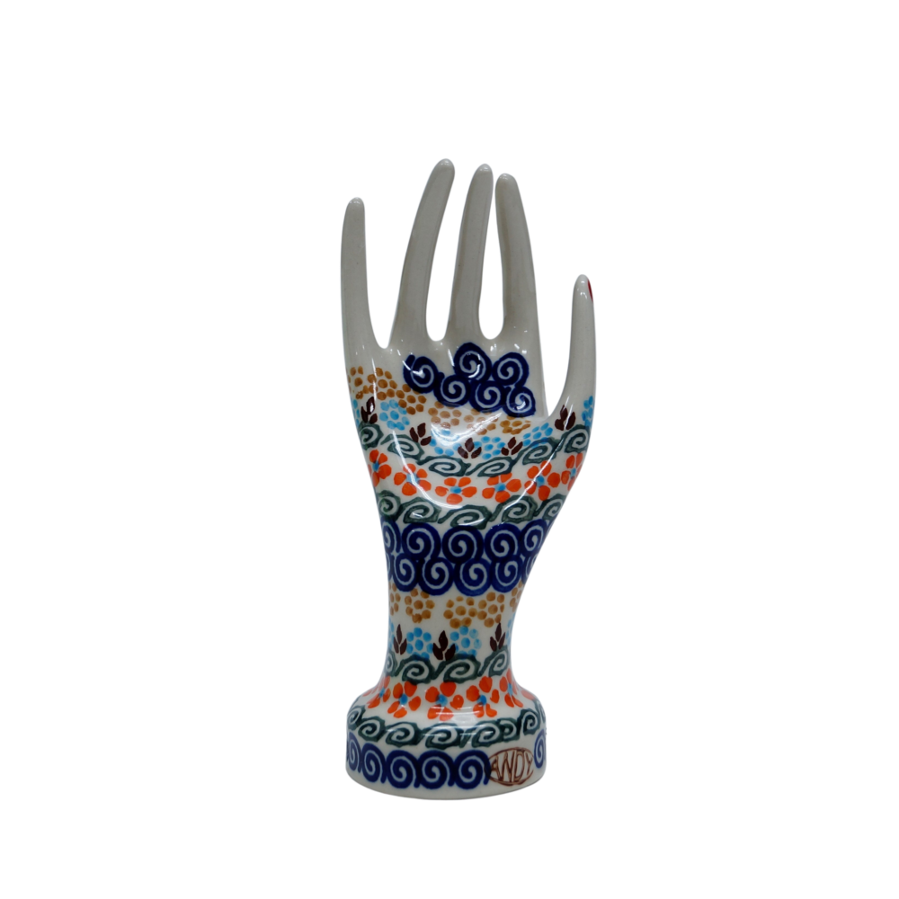 Ceramiczny stojak na biżuterię mały, w kształcie powabnej, damskiej dłoni ozdobionymi podszkliwnymi wzorami, prosto z Bolesławca – niczym przyodziany w wyjątkowo śliczną rękawiczkę, to oryginalny i nieoceniony wieszak dla kobiecych świecidełek. Rewelacyjnie wyglądający dodatek dekoracyjny a zarazem funkcjonalny kobiecej toaletki jak i łazienki, taki który pozwoli na zaprzestanie gubienia biżuterii w całym domu! Ahhh… skąd my to znamy! Dzięki szkliwieniu, jest bardzo łatwy w utrzymaniu czystości. Zawieszona na nim biżuteria taka jak, łańcuszki, kolczyki czy pierścionki będą zawsze pod ręką, ułożone w piękny sposób.