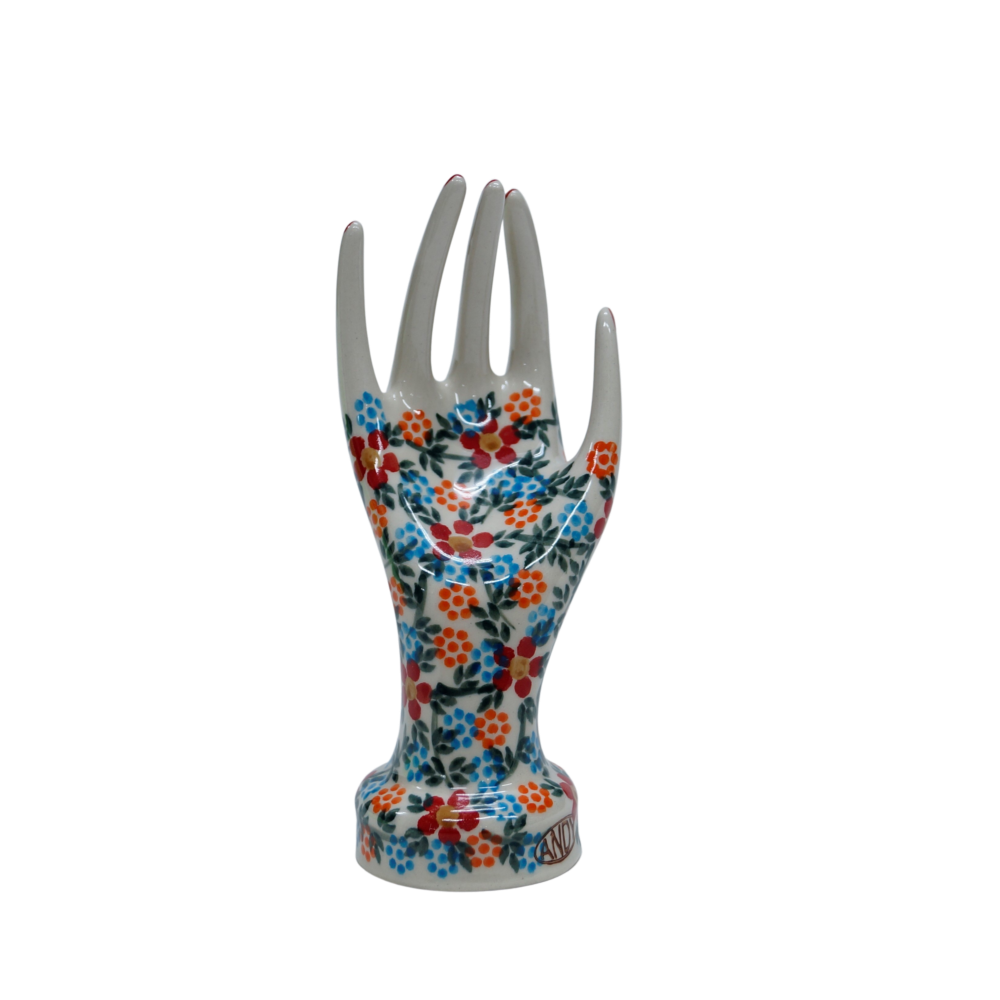 Ceramiczny stojak na biżuterię mały, w kształcie powabnej, damskiej dłoni ozdobionymi podszkliwnymi wzorami, prosto z Bolesławca – niczym przyodziany w wyjątkowo śliczną rękawiczkę, to oryginalny i nieoceniony wieszak dla kobiecych świecidełek. Rewelacyjnie wyglądający dodatek dekoracyjny a zarazem funkcjonalny kobiecej toaletki jak i łazienki, taki który pozwoli na zaprzestanie gubienia biżuterii w całym domu! Ahhh… skąd my to znamy! Dzięki szkliwieniu, jest bardzo łatwy w utrzymaniu czystości. Zawieszona na nim biżuteria taka jak, łańcuszki, kolczyki czy pierścionki będą zawsze pod ręką, ułożone w piękny sposób.