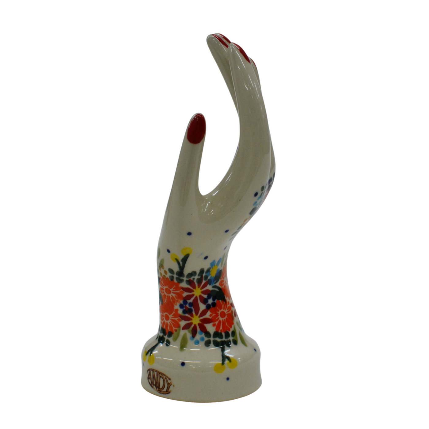 Ceramiczny stojak na biżuterię mały, w kształcie powabnej, damskiej dłoni ozdobionymi podszkliwnymi wzorami, prosto z Bolesławca – niczym przyodziany w wyjątkowo śliczną rękawiczkę, to oryginalny i nieoceniony wieszak dla kobiecych świecidełek. Rewelacyjnie wyglądający dodatek dekoracyjny a zarazem funkcjonalny kobiecej toaletki jak i łazienki, taki który pozwoli na zaprzestanie gubienia biżuterii w całym domu! Ahhh… skąd my to znamy! Dzięki szkliwieniu, jest bardzo łatwy w utrzymaniu czystości. Zawieszona na nim biżuteria taka jak, łańcuszki, kolczyki czy pierścionki będą zawsze pod ręką, ułożone w piękny sposób.