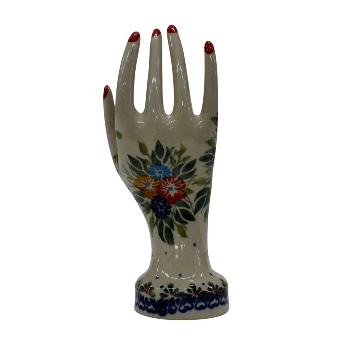 Ceramiczny stojak na biżuterię mały, w kształcie powabnej, damskiej dłoni ozdobionymi podszkliwnymi wzorami, prosto z Bolesławca – niczym przyodziany w wyjątkowo śliczną rękawiczkę, to oryginalny i nieoceniony wieszak dla kobiecych świecidełek. Rewelacyjnie wyglądający dodatek dekoracyjny a zarazem funkcjonalny kobiecej toaletki jak i łazienki, taki który pozwoli na zaprzestanie gubienia biżuterii w całym domu! Ahhh… skąd my to znamy! Dzięki szkliwieniu, jest bardzo łatwy w utrzymaniu czystości. Zawieszona na nim biżuteria taka jak, łańcuszki, kolczyki czy pierścionki będą zawsze pod ręką, ułożone w piękny sposób.