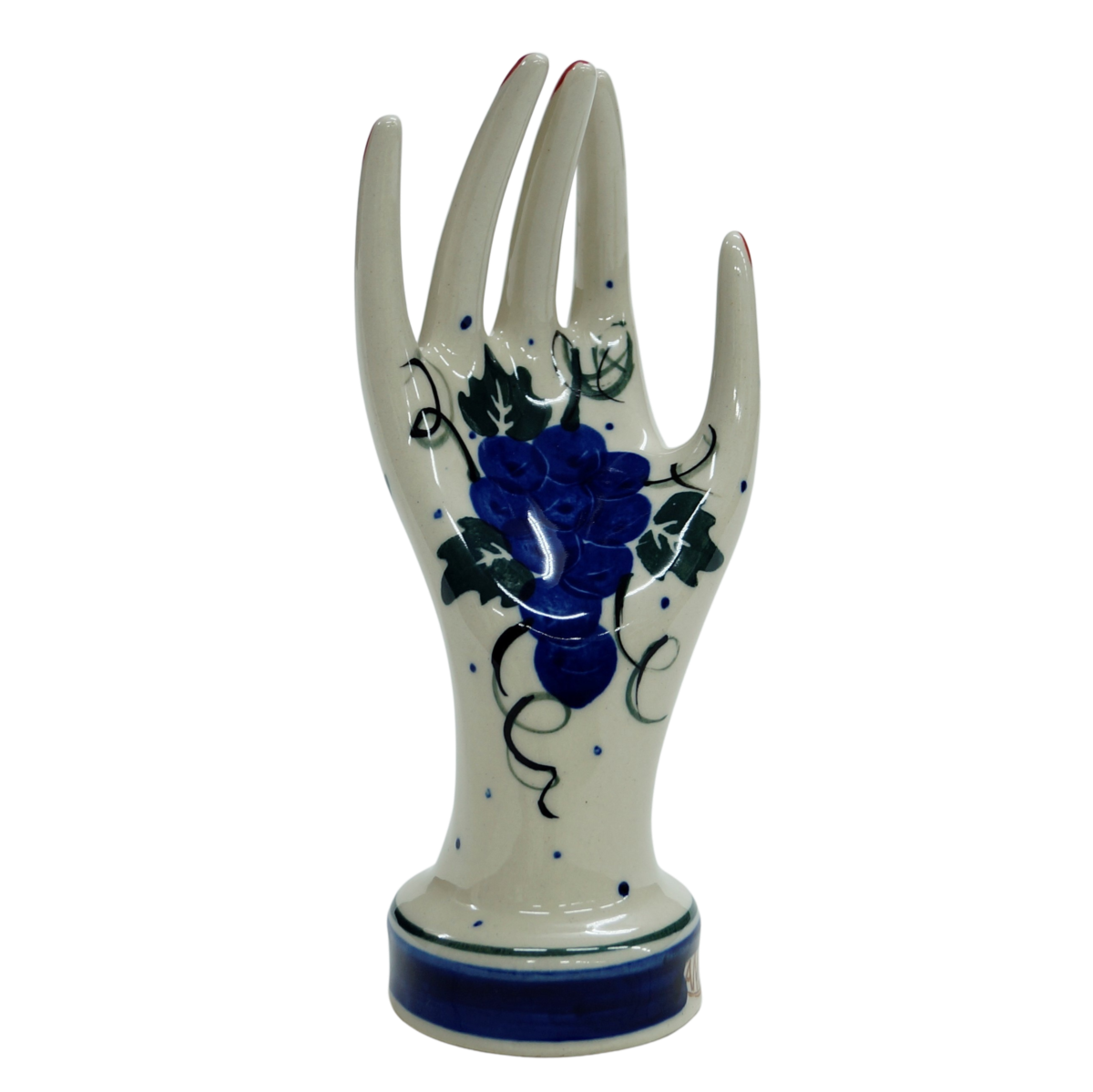 Ceramiczny stojak na biżuterię mały, w kształcie powabnej, damskiej dłoni ozdobionymi podszkliwnymi wzorami, prosto z Bolesławca – niczym przyodziany w wyjątkowo śliczną rękawiczkę, to oryginalny i nieoceniony wieszak dla kobiecych świecidełek. Rewelacyjnie wyglądający dodatek dekoracyjny a zarazem funkcjonalny kobiecej toaletki jak i łazienki, taki który pozwoli na zaprzestanie gubienia biżuterii w całym domu! Ahhh… skąd my to znamy! Dzięki szkliwieniu, jest bardzo łatwy w utrzymaniu czystości. Zawieszona na nim biżuteria taka jak, łańcuszki, kolczyki czy pierścionki będą zawsze pod ręką, ułożone w piękny sposób.