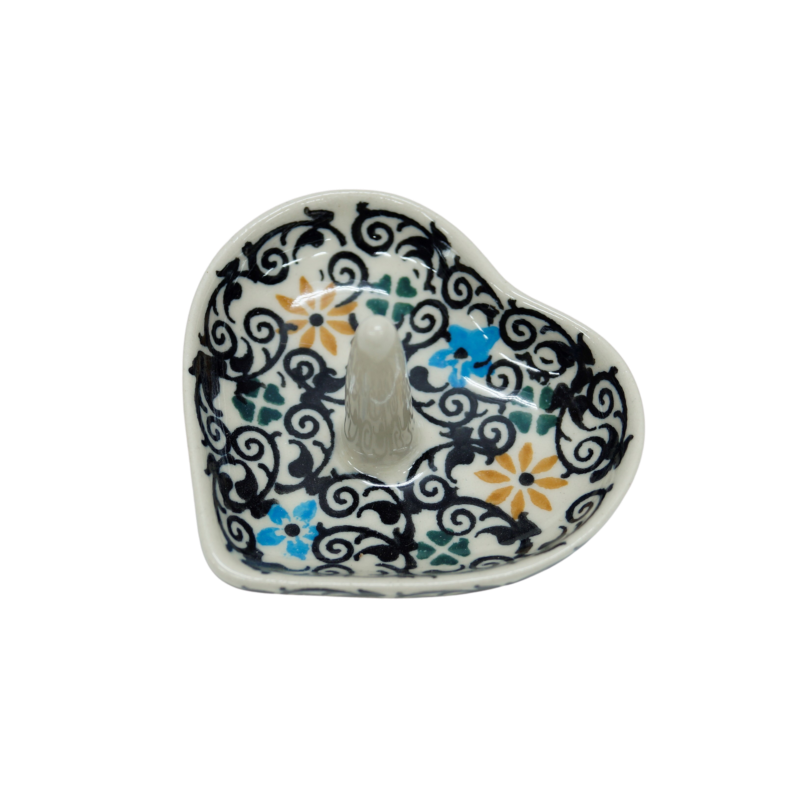 Ceramiczny stojak, podstawka na biżuterię w kształcie serca z trzpieniem. Wyrób ceramiczny dekoracyjny, ozdobionymi podszkliwnymi wzorami, prosto z Bolesławca, to oryginalny i nieoceniony wieszak/stojak dla kobiecych świecidełek. Rewelacyjnie wyglądający dodatek dekoracyjny a zarazem funkcjonalny kobiecej toaletki jak i łazienki, taki który pozwoli na zaprzestanie gubienia biżuterii w całym domu! Ahhh… skąd my to znamy! Dzięki szkliwieniu, jest bardzo łatwy w utrzymaniu czystości. Zawieszona na nim biżuteria taka jak, łańcuszki, kolczyki czy pierścionki będą zawsze pod ręką, ułożone w piękny sposób.