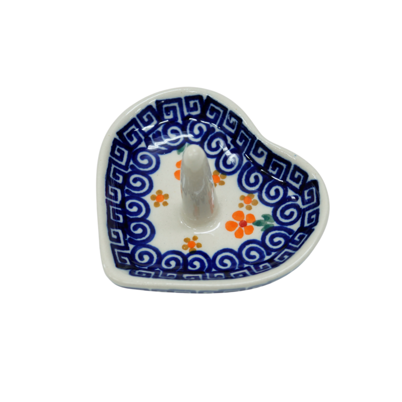 Ceramiczny stojak, podstawka na biżuterię w kształcie serca z trzpieniem. Wyrób ceramiczny dekoracyjny, ozdobionymi podszkliwnymi wzorami, prosto z Bolesławca, to oryginalny i nieoceniony wieszak/stojak dla kobiecych świecidełek. Rewelacyjnie wyglądający dodatek dekoracyjny a zarazem funkcjonalny kobiecej toaletki jak i łazienki, taki który pozwoli na zaprzestanie gubienia biżuterii w całym domu! Ahhh… skąd my to znamy! Dzięki szkliwieniu, jest bardzo łatwy w utrzymaniu czystości. Zawieszona na nim biżuteria taka jak, łańcuszki, kolczyki czy pierścionki będą zawsze pod ręką, ułożone w piękny sposób.