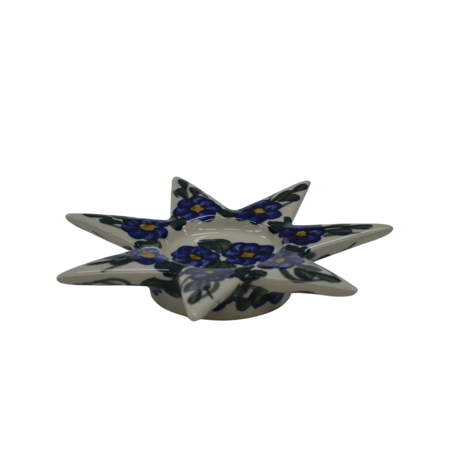 Ceramiczny świecznik w kształcie gwiazdy, oryginalny wyrób ceramiki użytkowej z Bolesławca. Świecznik może być używany z podgrzewaczem tealight bądź z tradycyjną świeczką stojącą stołową.