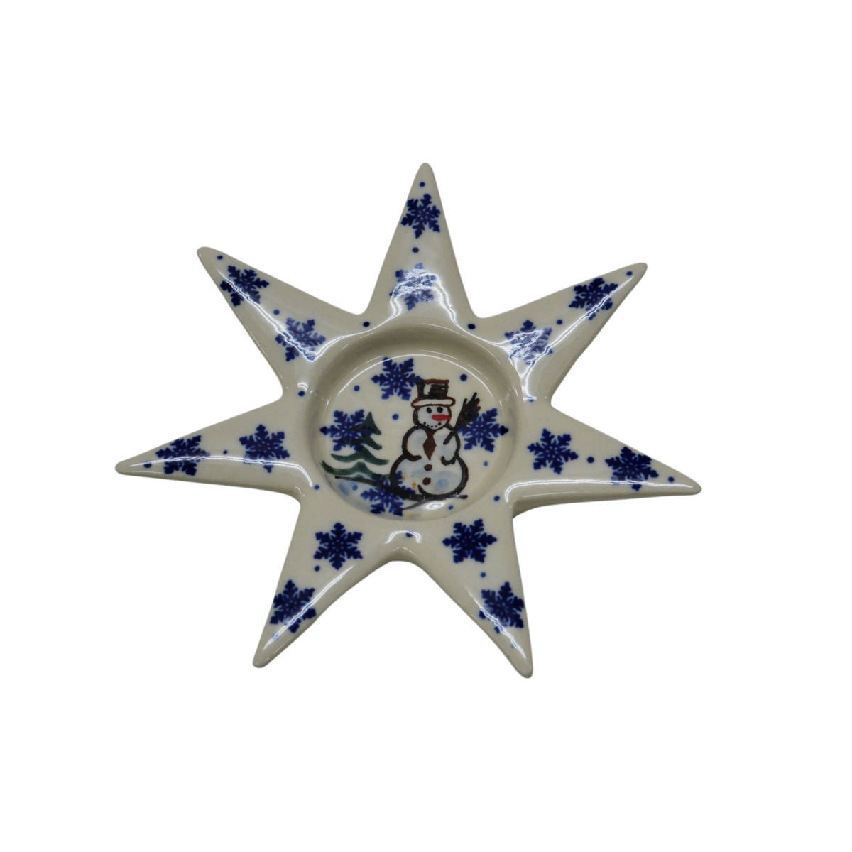 Ceramiczny świecznik w kształcie gwiazdy, oryginalny wyrób ceramiki użytkowej z Bolesławca. Świecznik może być używany z podgrzewaczem tealight bądź z tradycyjną świeczką stojącą stołową.
