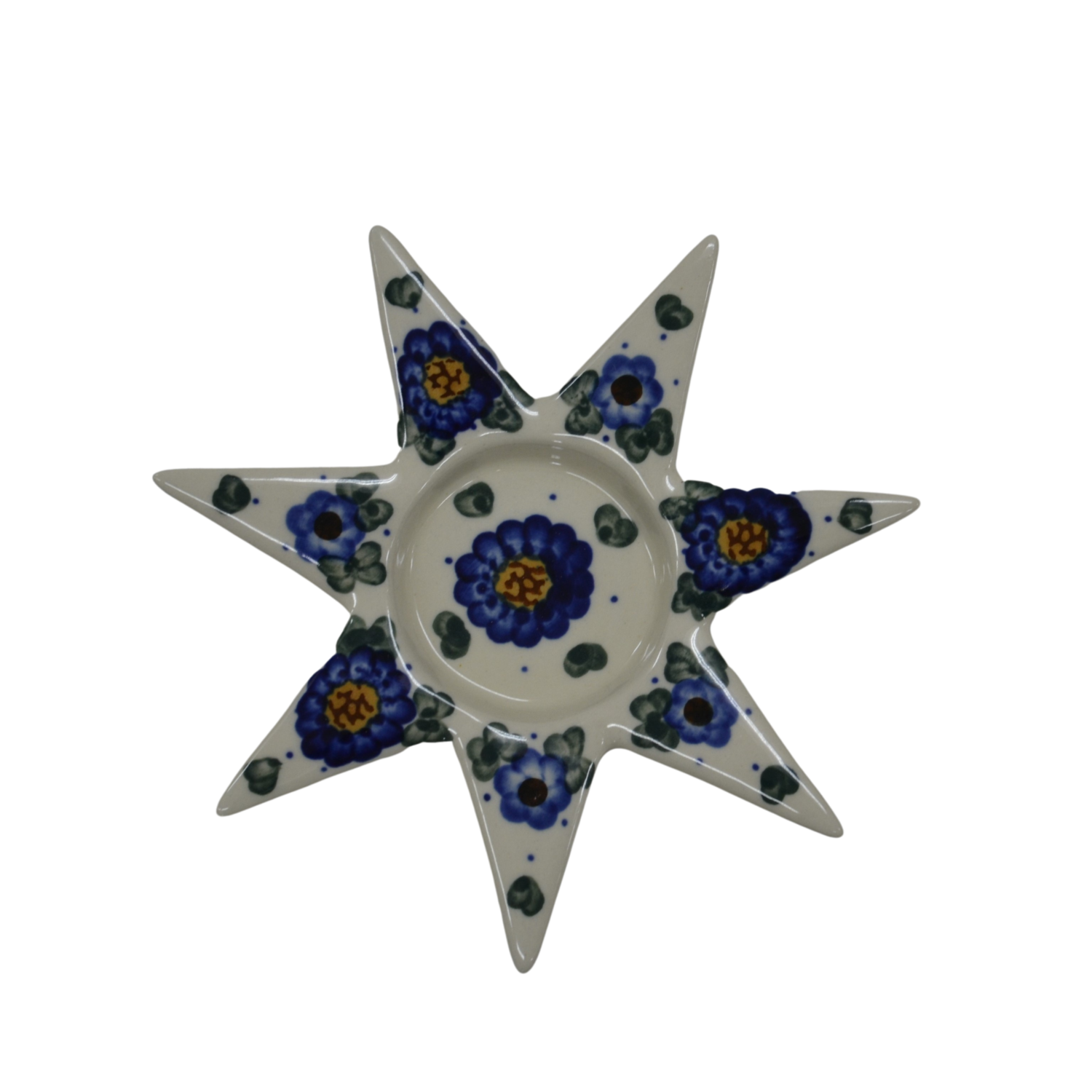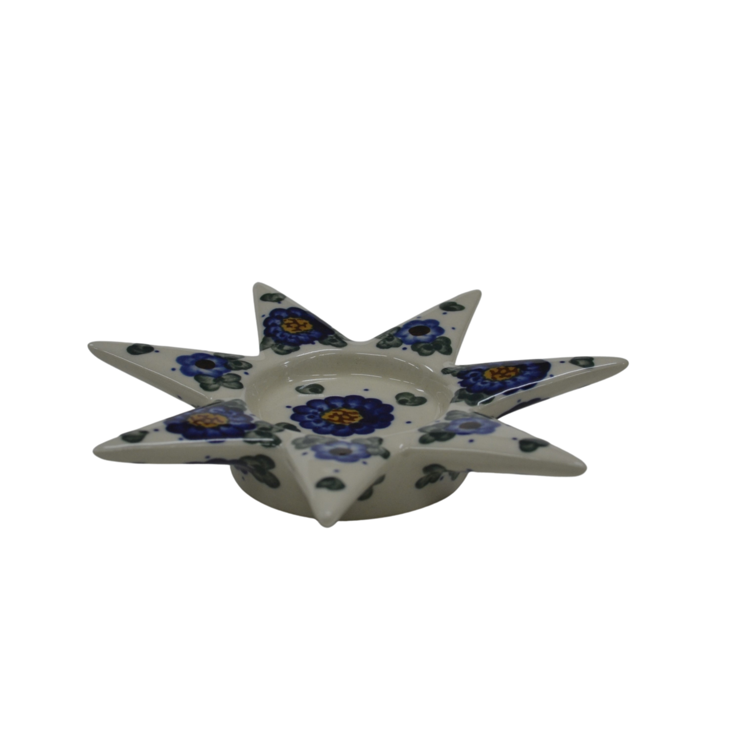 Ceramiczny świecznik w kształcie gwiazdy, oryginalny wyrób ceramiki użytkowej z Bolesławca. Świecznik może być używany z podgrzewaczem tealight bądź z tradycyjną świeczką stojącą stołową.