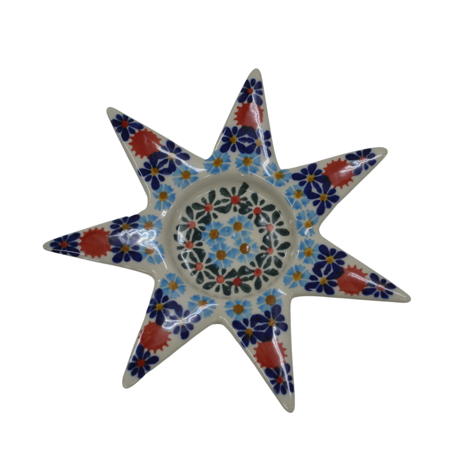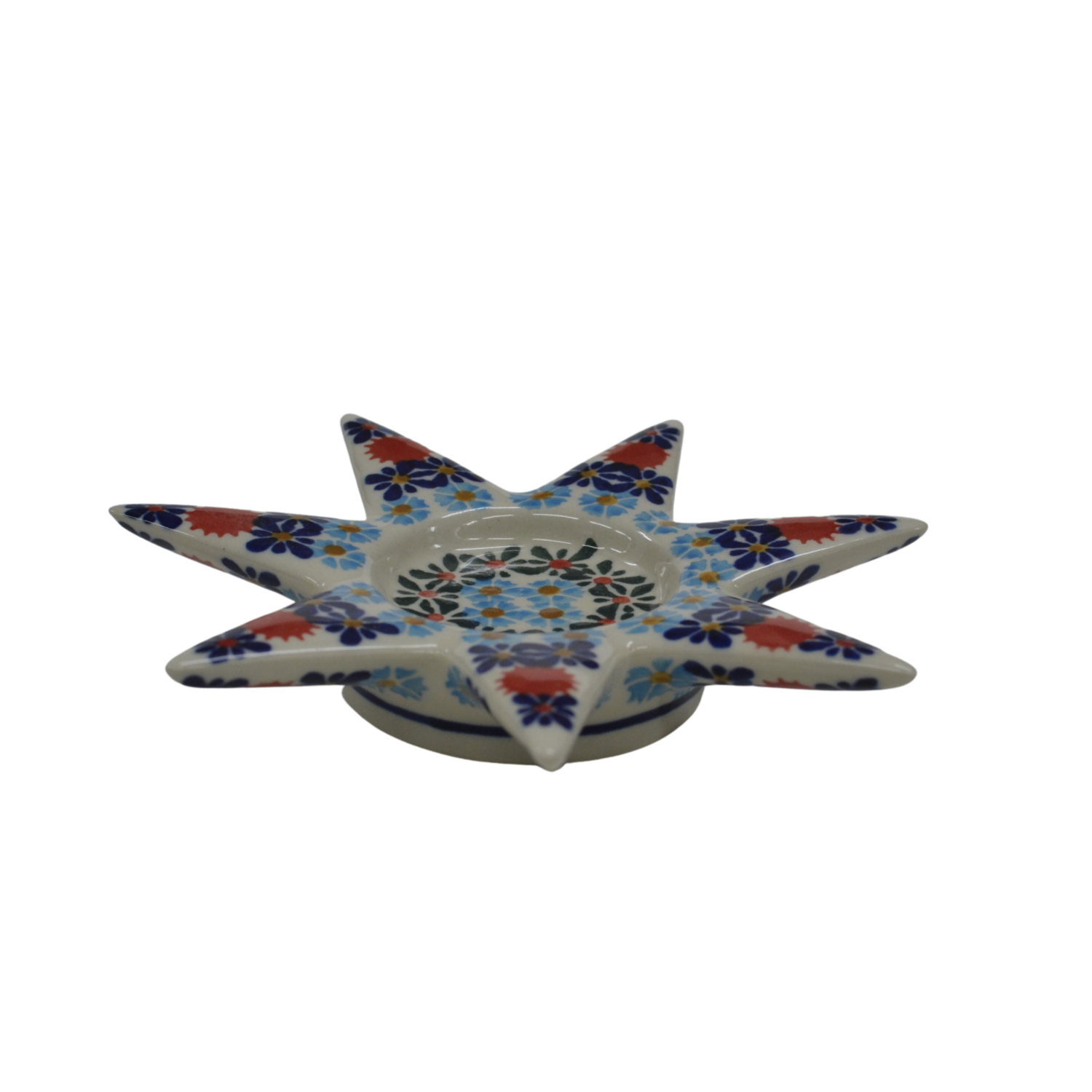 Ceramiczny świecznik w kształcie gwiazdy, oryginalny wyrób ceramiki użytkowej z Bolesławca. Świecznik może być używany z podgrzewaczem tealight bądź z tradycyjną świeczką stojącą stołową.