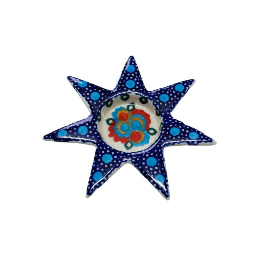 Ceramiczny świecznik w kształcie gwiazdy, oryginalny wyrób ceramiki użytkowej z Bolesławca. Świecznik może być używany z podgrzewaczem tealight bądź z tradycyjną świeczką stojącą stołową.