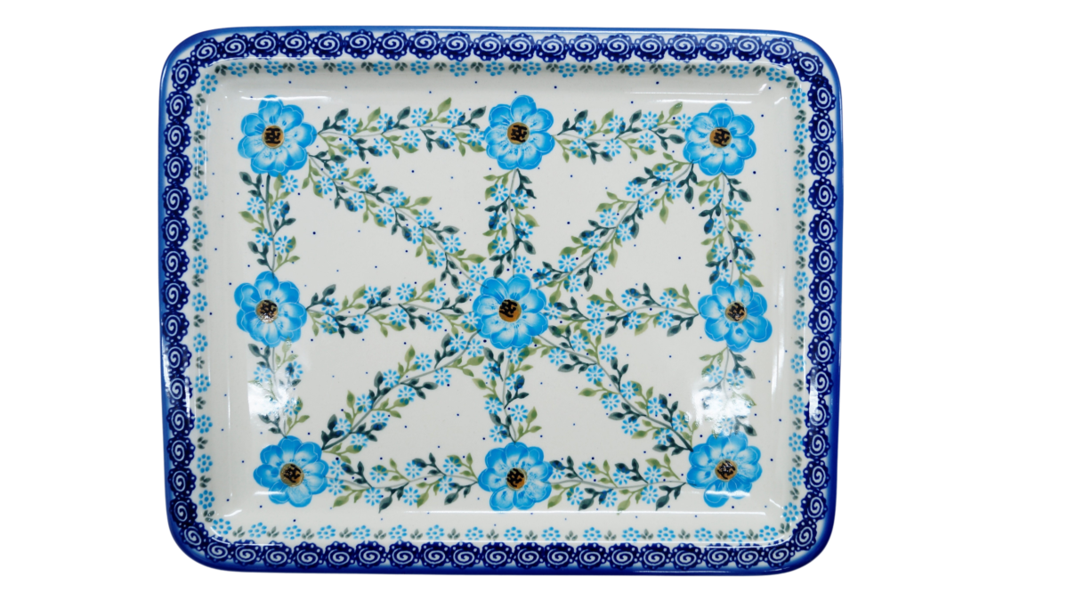 Taca do serwowania potraw to ręcznie malowany wyrób oryginalnej ceramiki bolesławieckiej. Każda dekoracja ceramiki artystycznej z naszej rodzinnej manufaktury powstała z najwyższą dbałością o detale i wysoką jakość i trwałość naczyń.