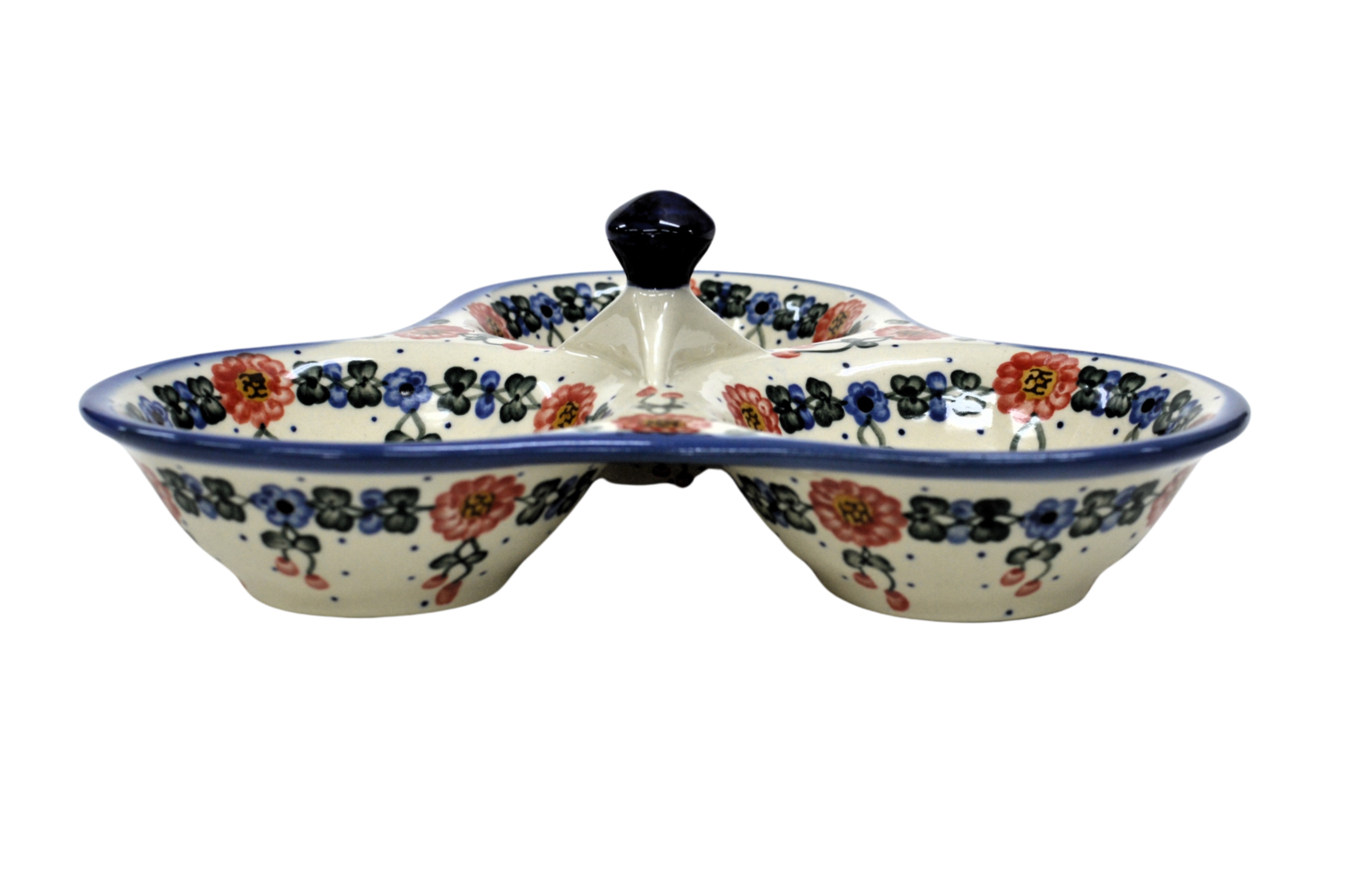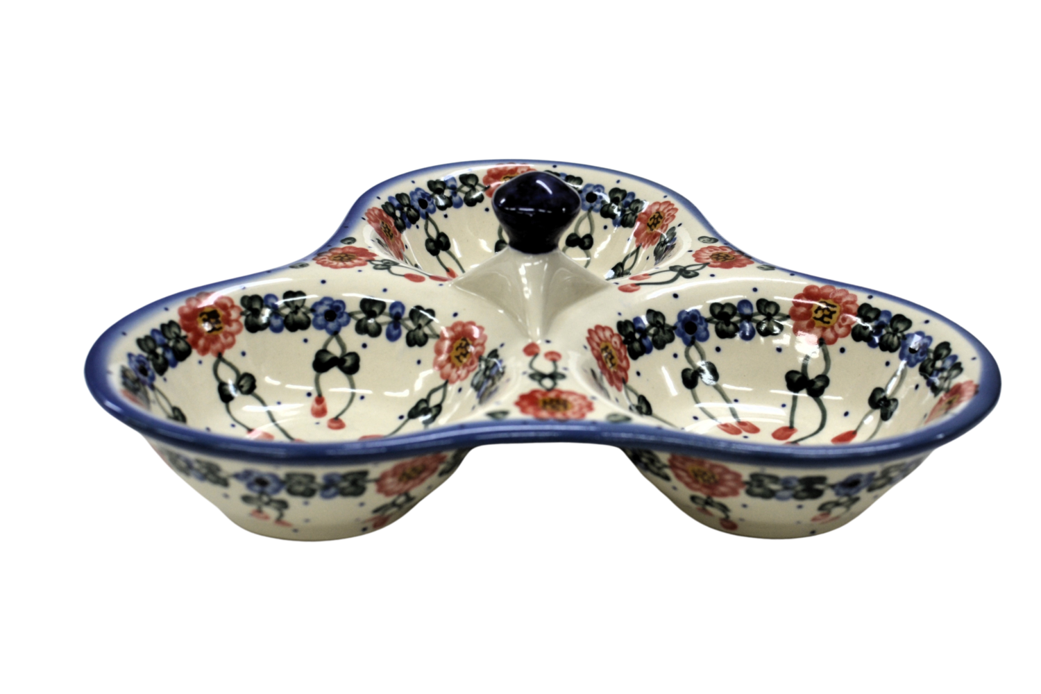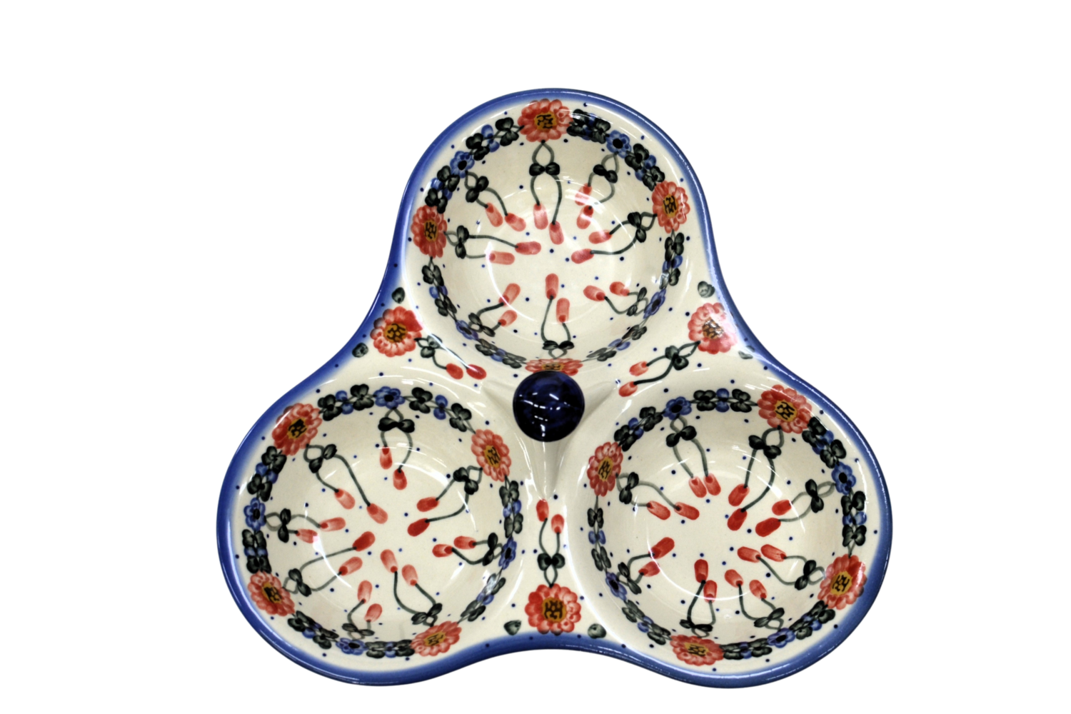 Tacka do serwowania, potrójna, stworzona zostało jako naczynie ceramiczne do podawania przypraw, przecież w naszych domach gotujemy potrawy i smakujemy smaków kuchni z całego świata a dodatkowo mieszamy smaki i przyprawy tworząc prawdziwe kulinarne cuda.