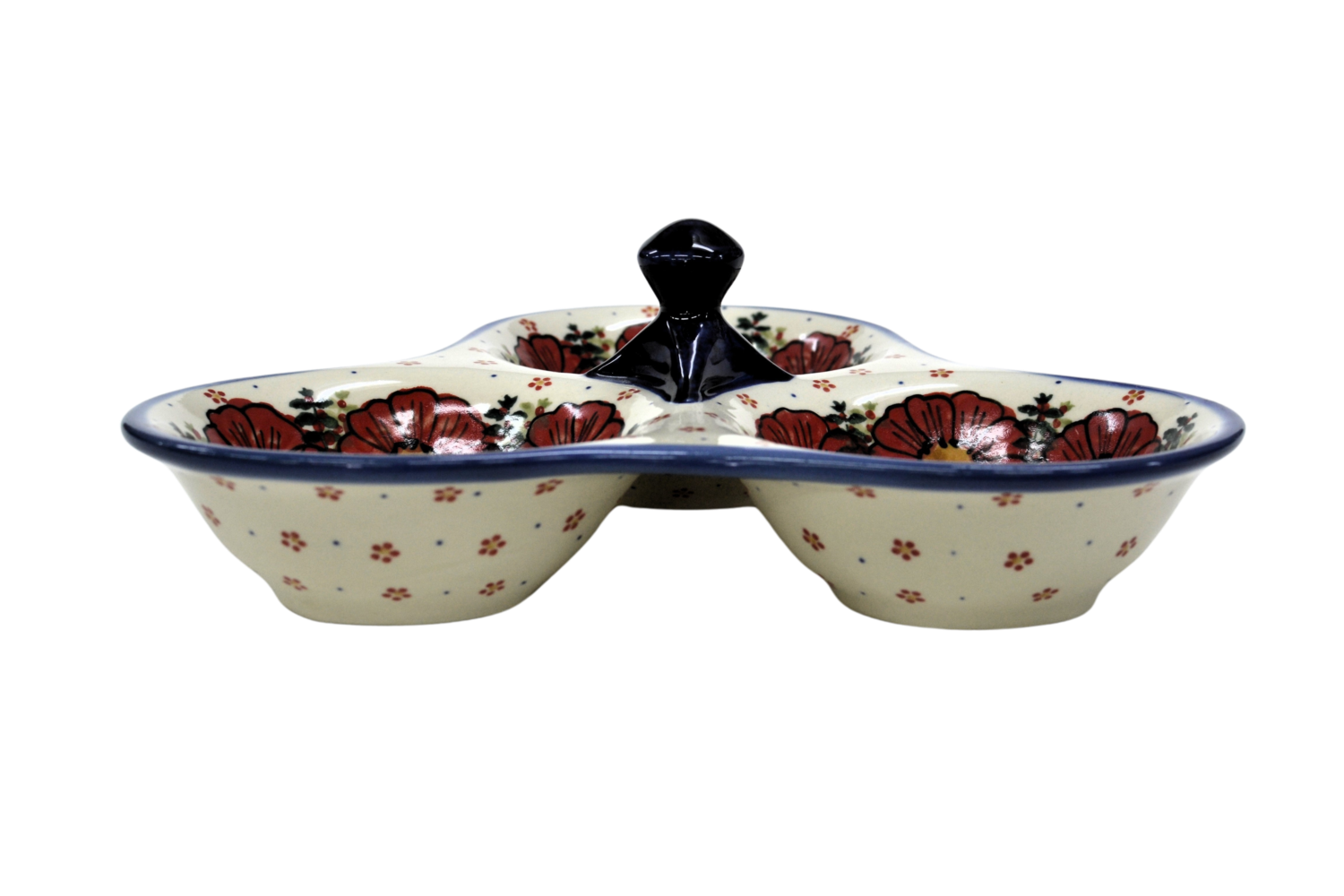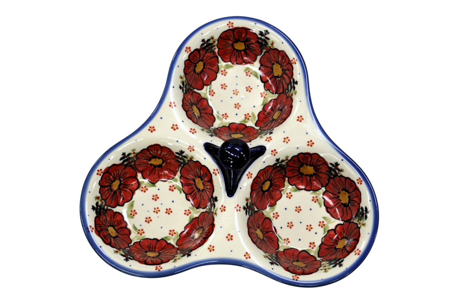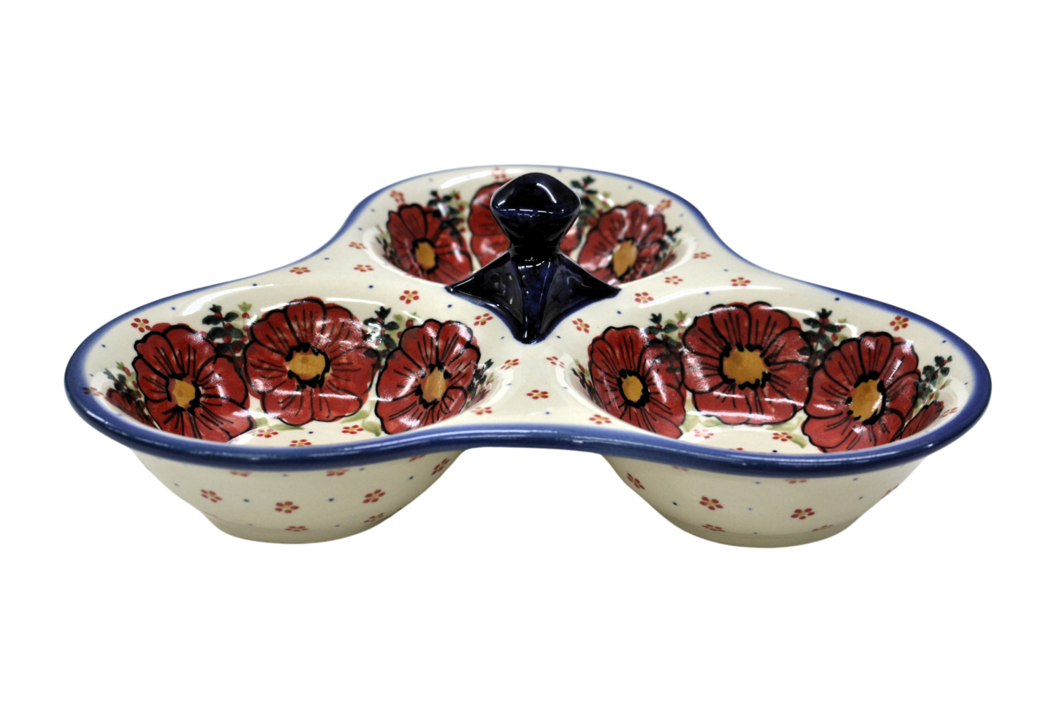 Tacka do serwowania, potrójna, stworzona zostało jako naczynie ceramiczne do podawania przypraw, przecież w naszych domach gotujemy potrawy i smakujemy smaków kuchni z całego świata a dodatkowo mieszamy smaki i przyprawy tworząc prawdziwe kulinarne cuda.