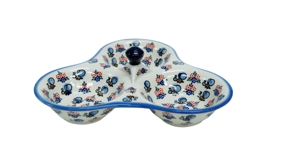 Tacka do serwowania, potrójna, stworzona zostało jako naczynie ceramiczne do podawania przypraw, przecież w naszych domach gotujemy potrawy i smakujemy smaków kuchni z całego świata a dodatkowo mieszamy smaki i przyprawy tworząc prawdziwe kulinarne cuda.