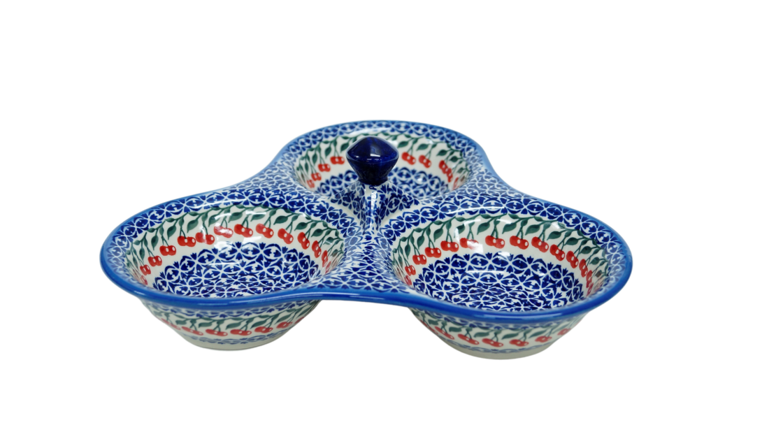 Tacka do serwowania, potrójna, stworzona zostało jako naczynie ceramiczne do podawania przypraw, przecież w naszych domach gotujemy potrawy i smakujemy smaków kuchni z całego świata a dodatkowo mieszamy smaki i przyprawy tworząc prawdziwe kulinarne cuda.
