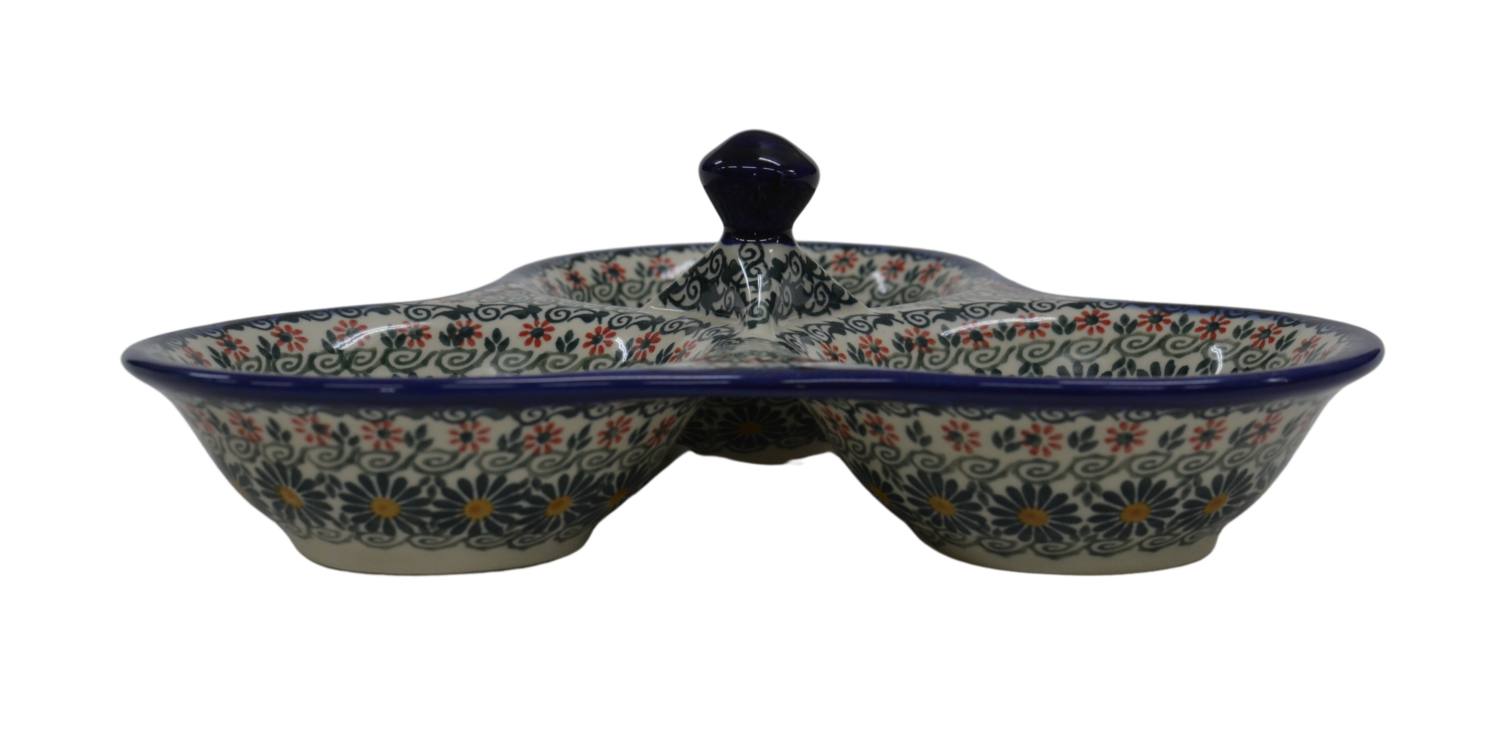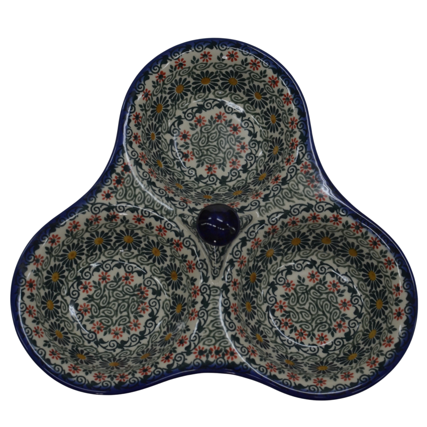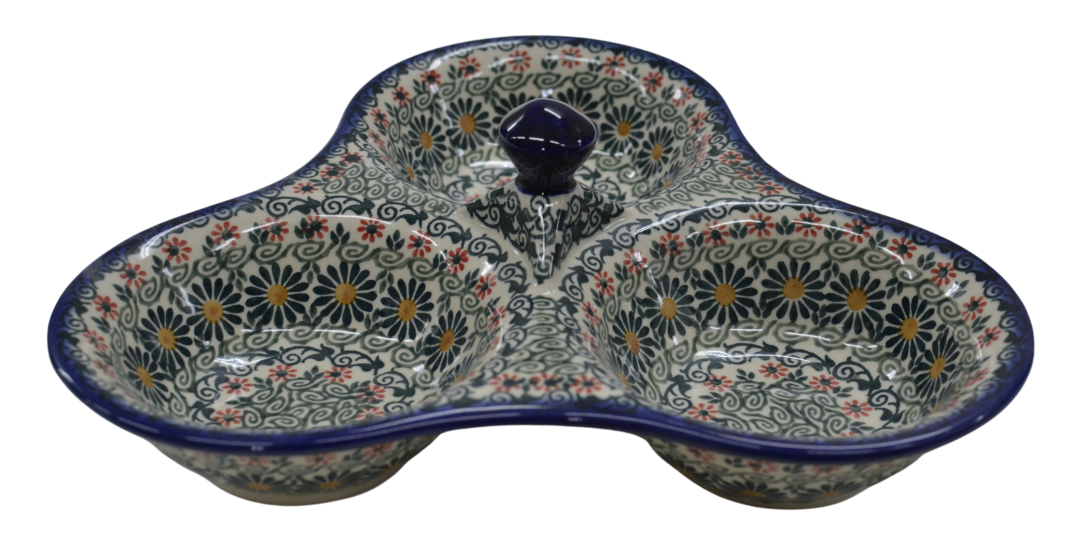 Tacka do serwowania, potrójna, stworzona zostało jako naczynie ceramiczne do podawania przypraw, przecież w naszych domach gotujemy potrawy i smakujemy smaków kuchni z całego świata a dodatkowo mieszamy smaki i przyprawy tworząc prawdziwe kulinarne cuda.