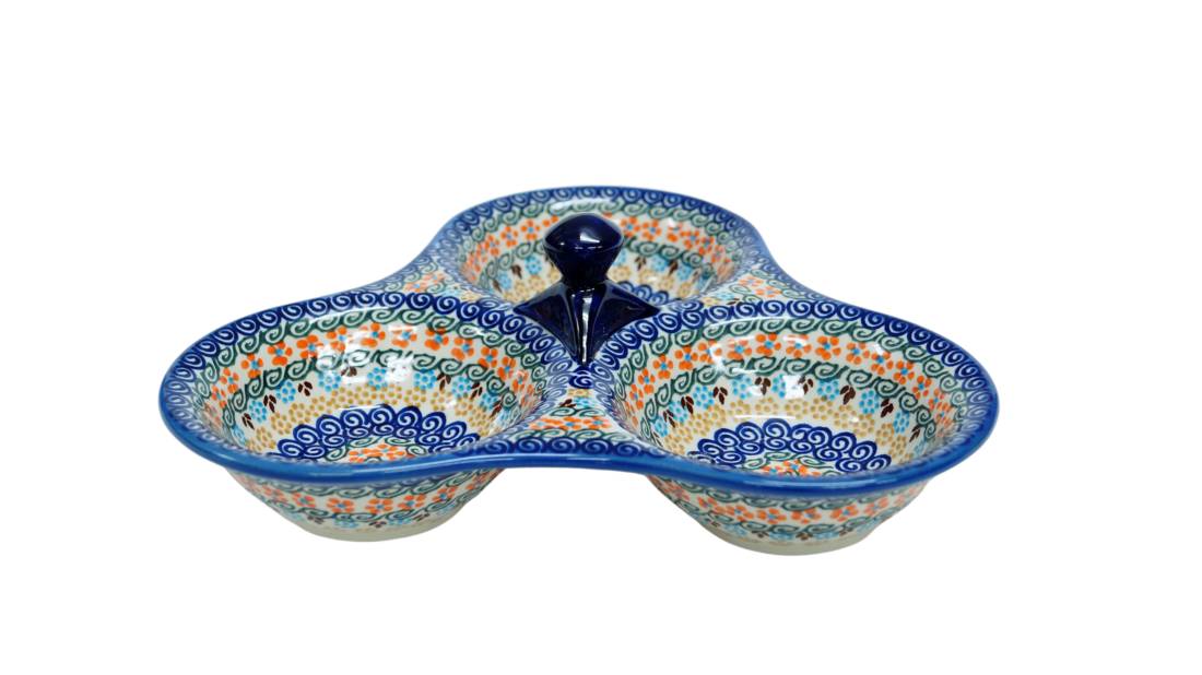 Tacka do serwowania, potrójna, stworzona zostało jako naczynie ceramiczne do podawania przypraw, przecież w naszych domach gotujemy potrawy i smakujemy smaków kuchni z całego świata a dodatkowo mieszamy smaki i przyprawy tworząc prawdziwe kulinarne cuda.