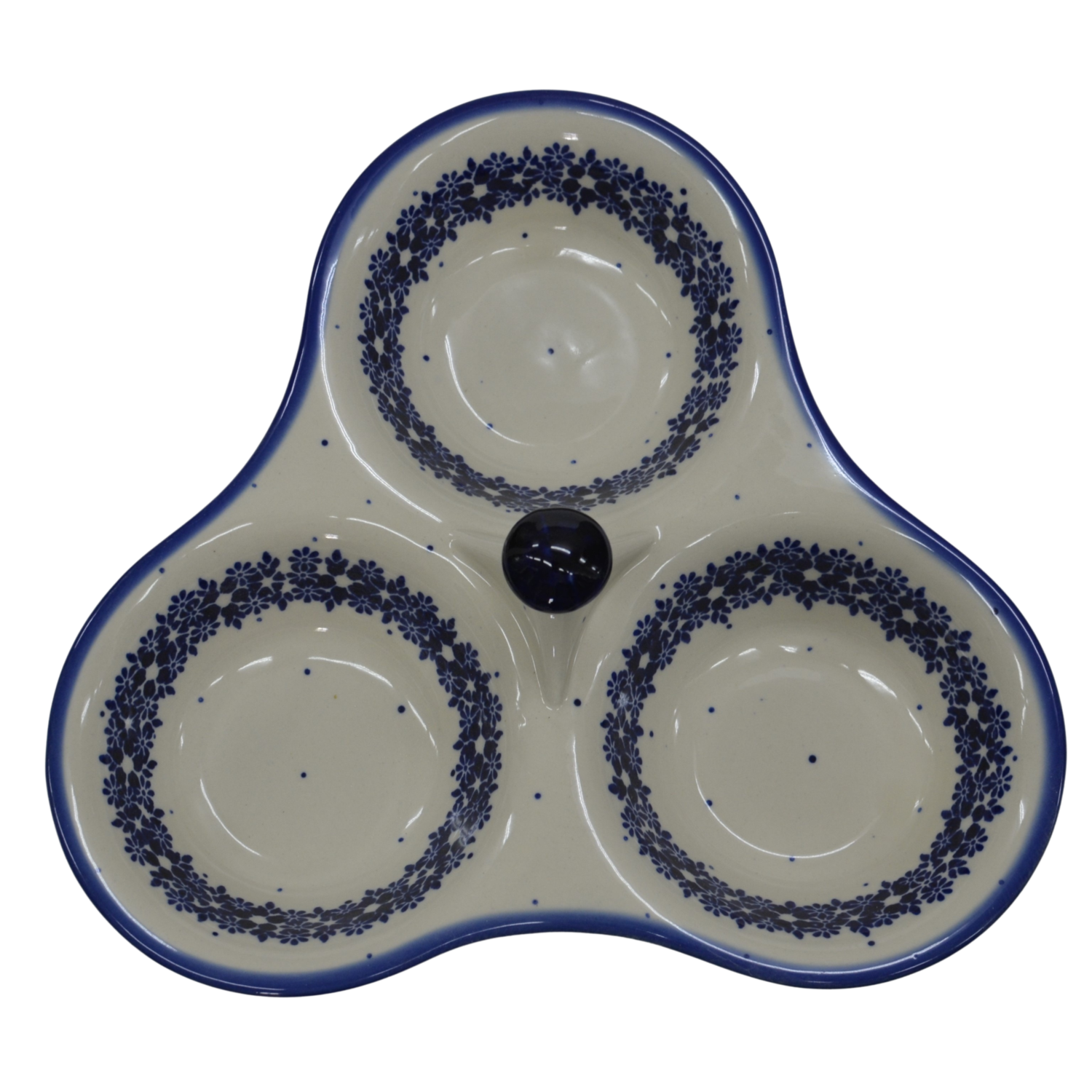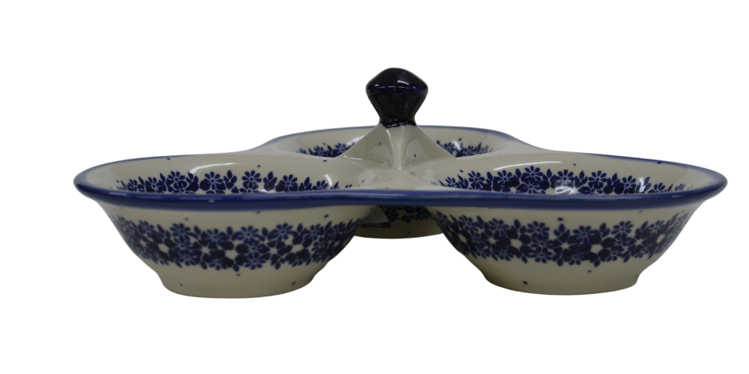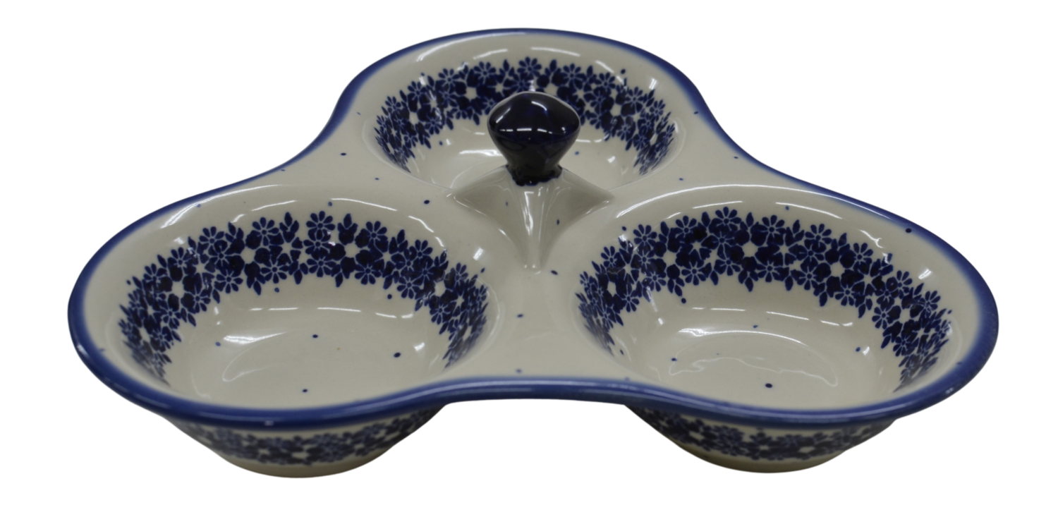 Tacka do serwowania, potrójna, stworzona zostało jako naczynie ceramiczne do podawania przypraw, przecież w naszych domach gotujemy potrawy i smakujemy smaków kuchni z całego świata a dodatkowo mieszamy smaki i przyprawy tworząc prawdziwe kulinarne cuda.