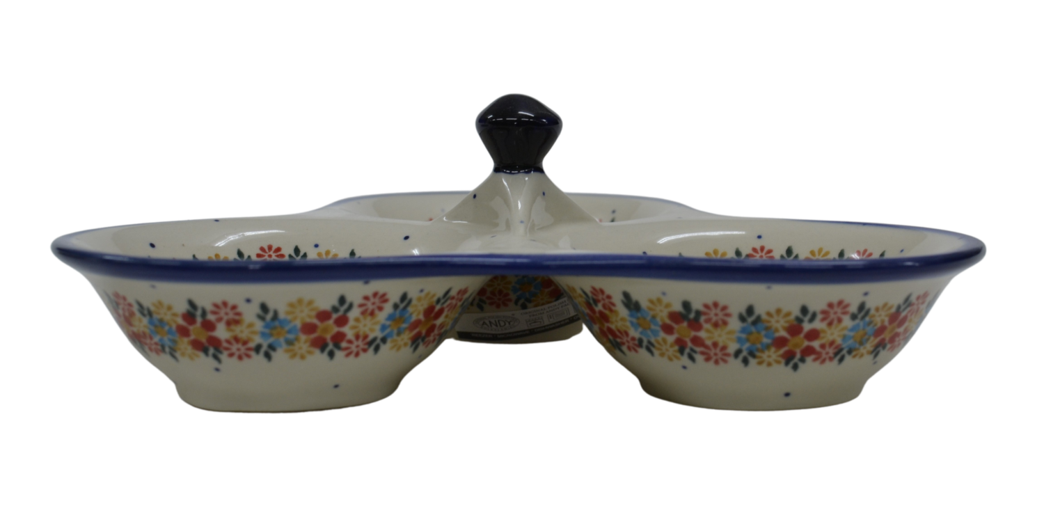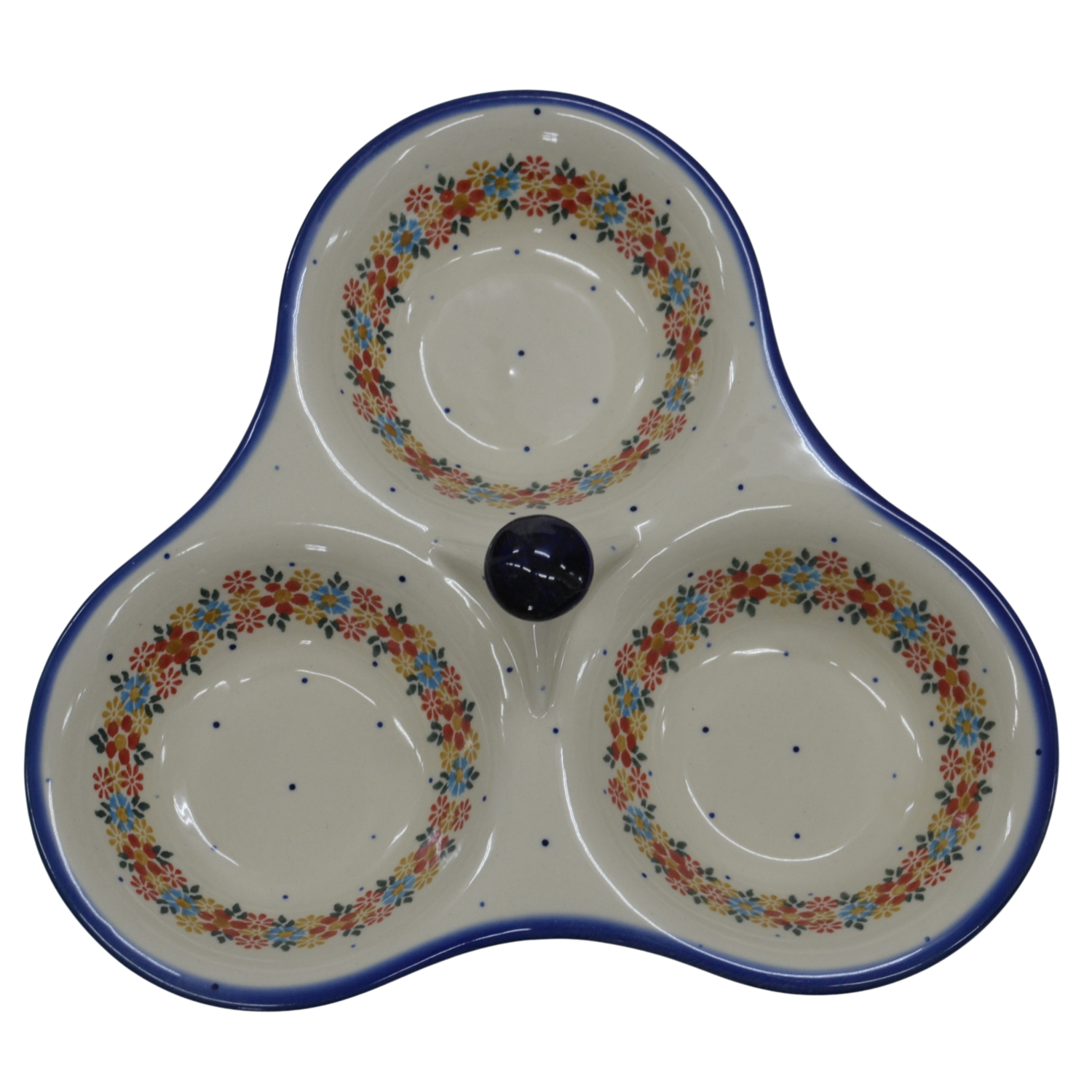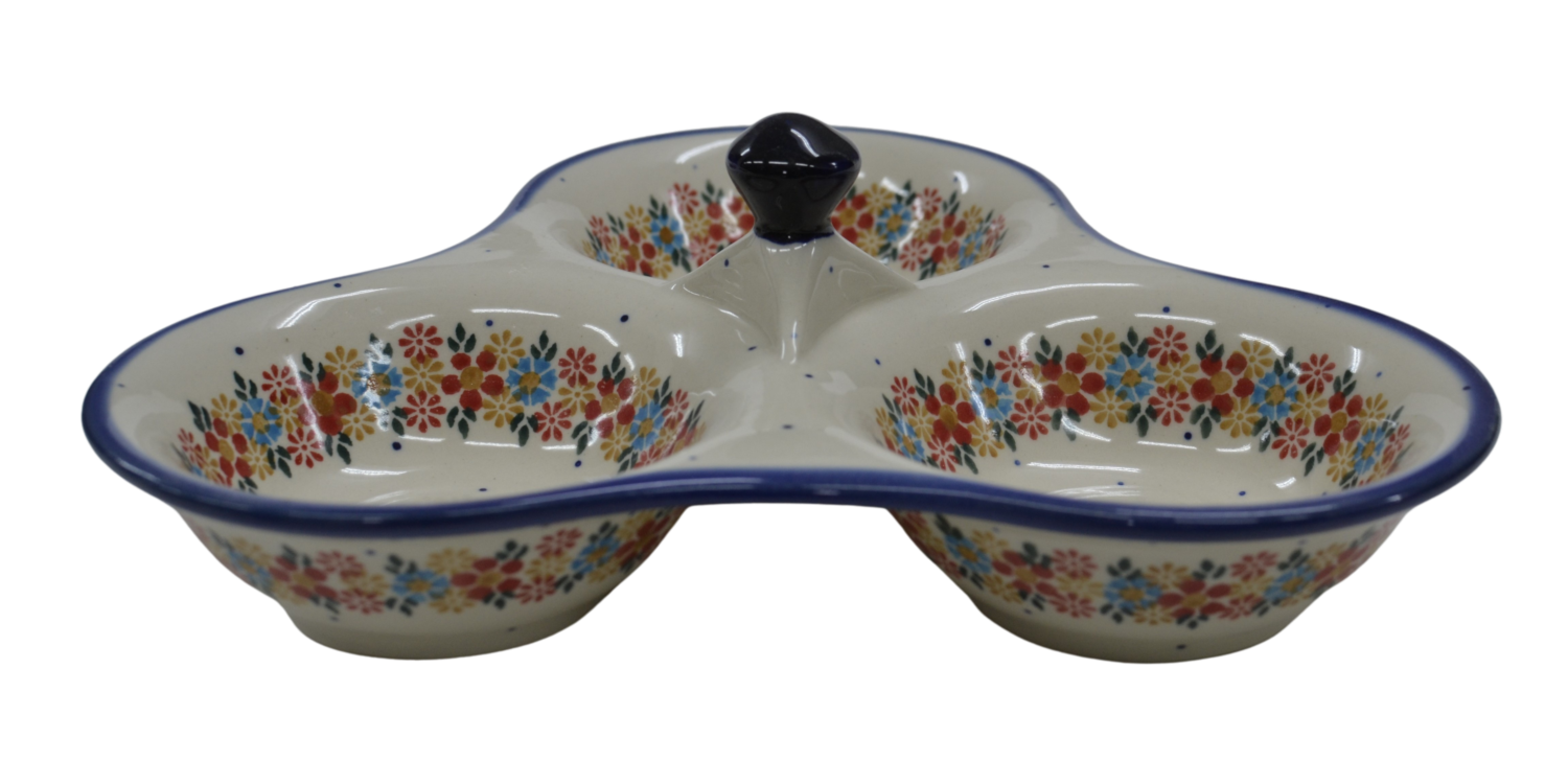 Tacka do serwowania, potrójna, stworzona zostało jako naczynie ceramiczne do podawania przypraw, przecież w naszych domach gotujemy potrawy i smakujemy smaków kuchni z całego świata a dodatkowo mieszamy smaki i przyprawy tworząc prawdziwe kulinarne cuda.