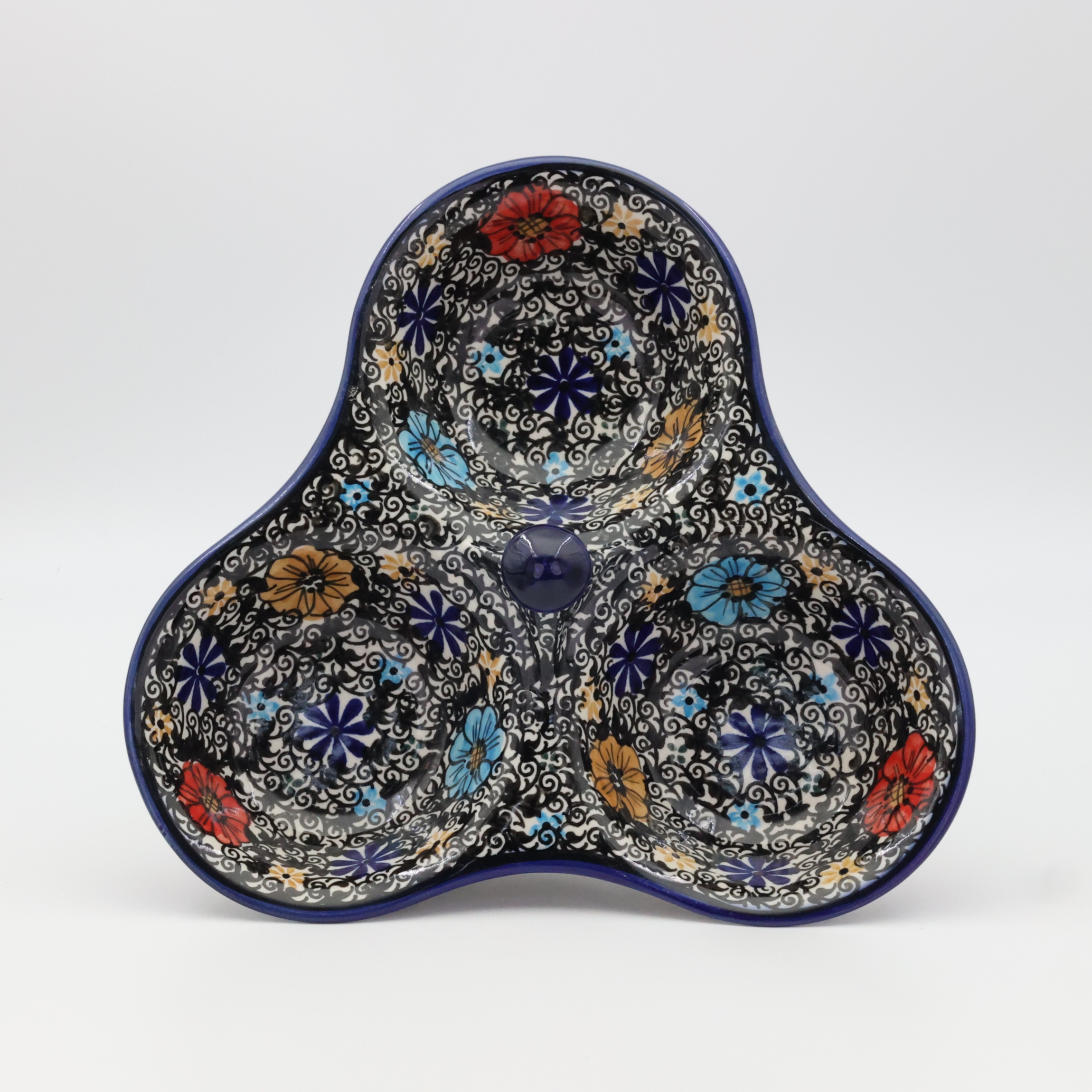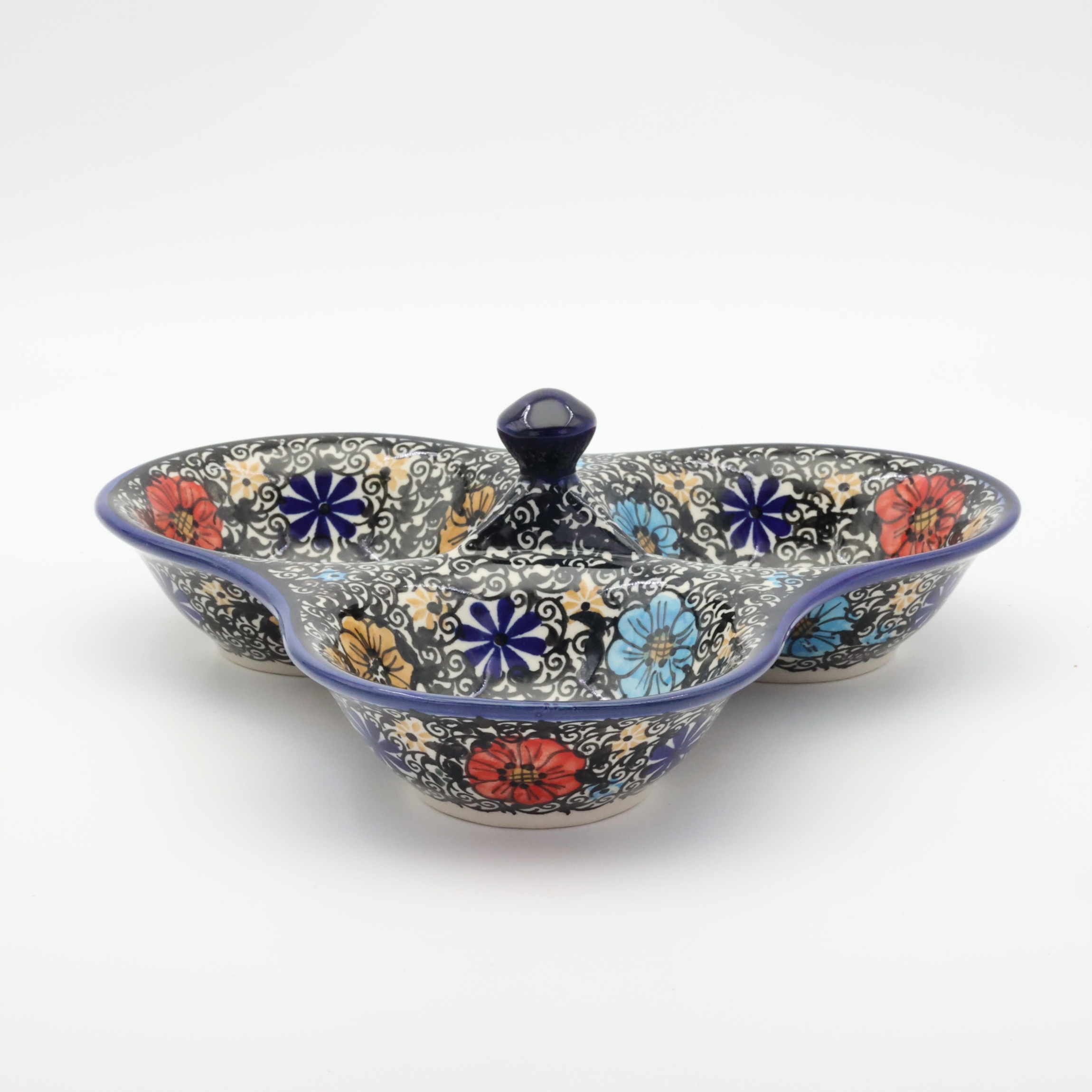 Tacka do serwowania, potrójna, stworzona zostało jako naczynie ceramiczne do podawania przypraw, przecież w naszych domach gotujemy potrawy i smakujemy smaków kuchni z całego świata a dodatkowo mieszamy smaki i przyprawy tworząc prawdziwe kulinarne cuda.