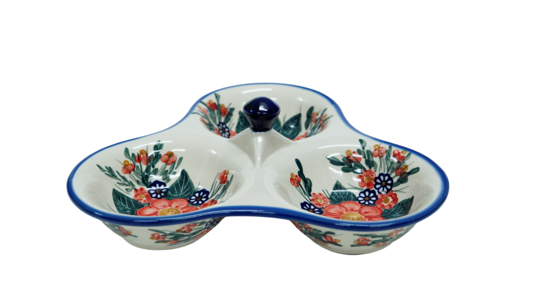 Tacka do serwowania, potrójna, stworzona zostało jako naczynie ceramiczne do podawania przypraw, przecież w naszych domach gotujemy potrawy i smakujemy smaków kuchni z całego świata a dodatkowo mieszamy smaki i przyprawy tworząc prawdziwe kulinarne cuda.