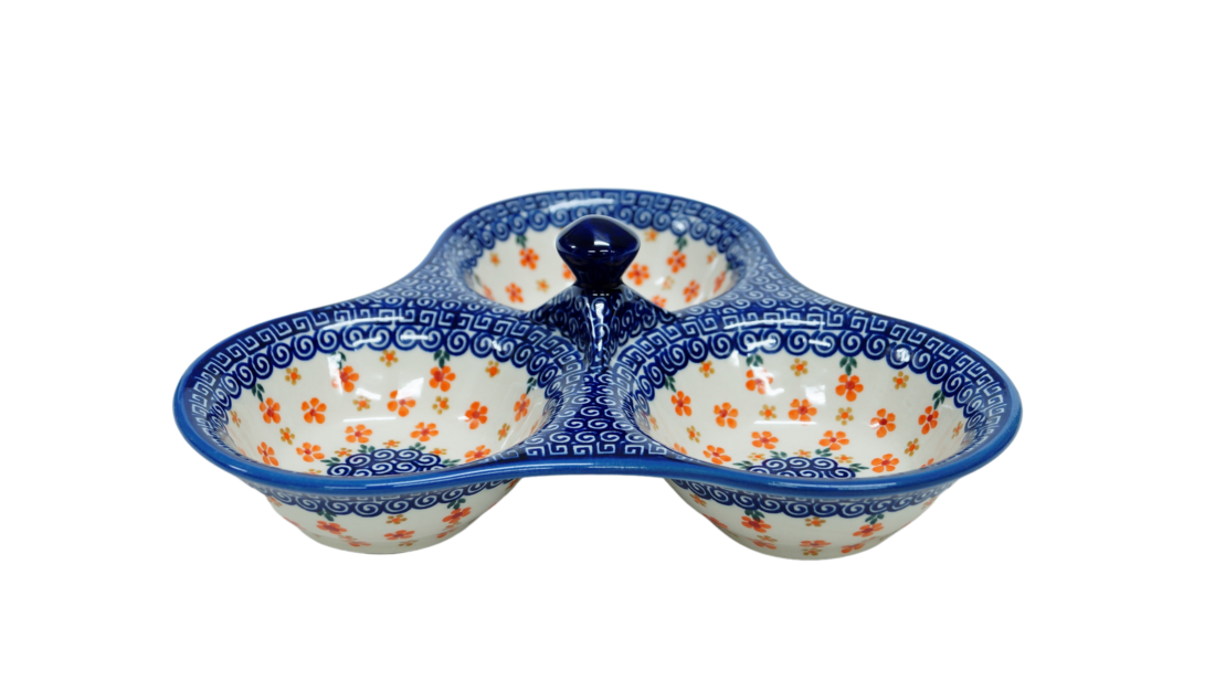 Tacka do serwowania, potrójna, stworzona zostało jako naczynie ceramiczne do podawania przypraw, przecież w naszych domach gotujemy potrawy i smakujemy smaków kuchni z całego świata a dodatkowo mieszamy smaki i przyprawy tworząc prawdziwe kulinarne cuda.