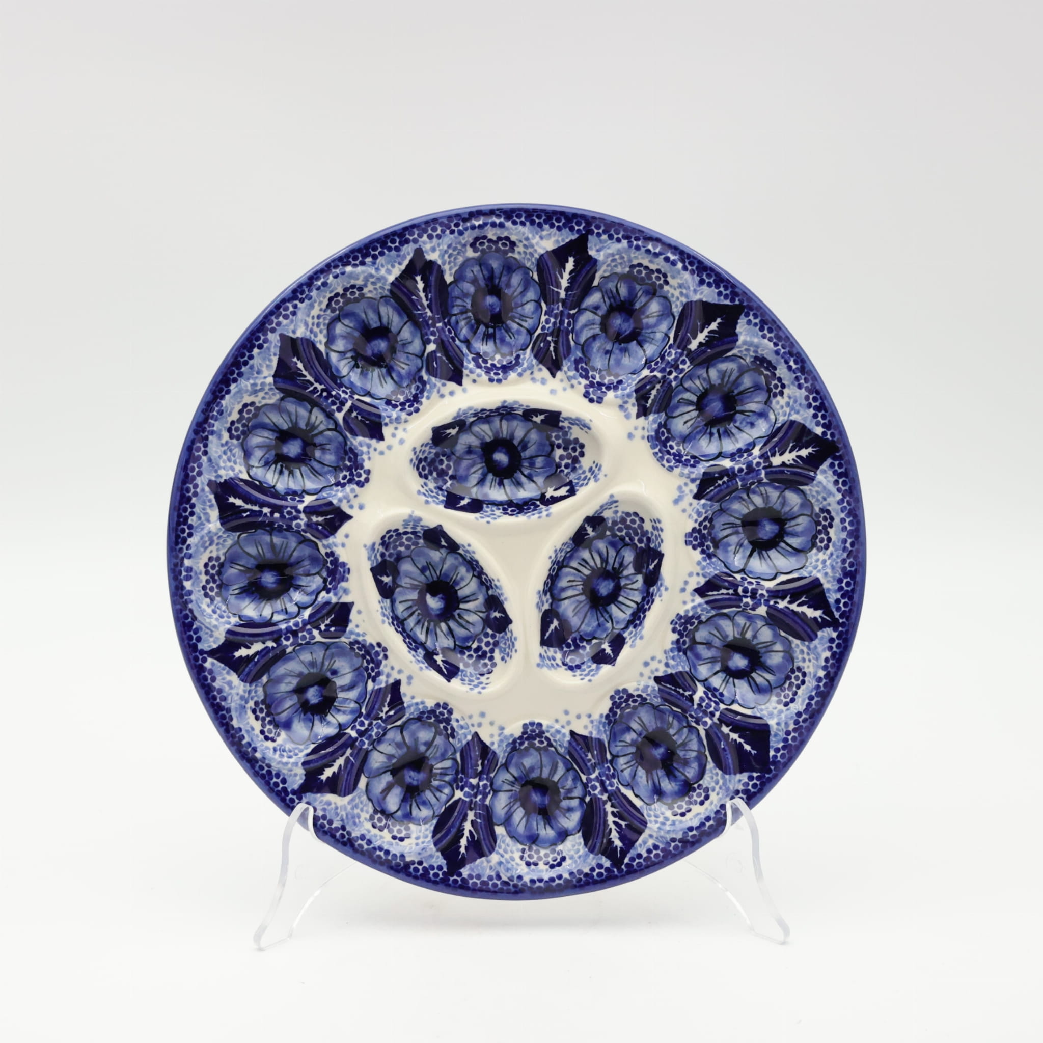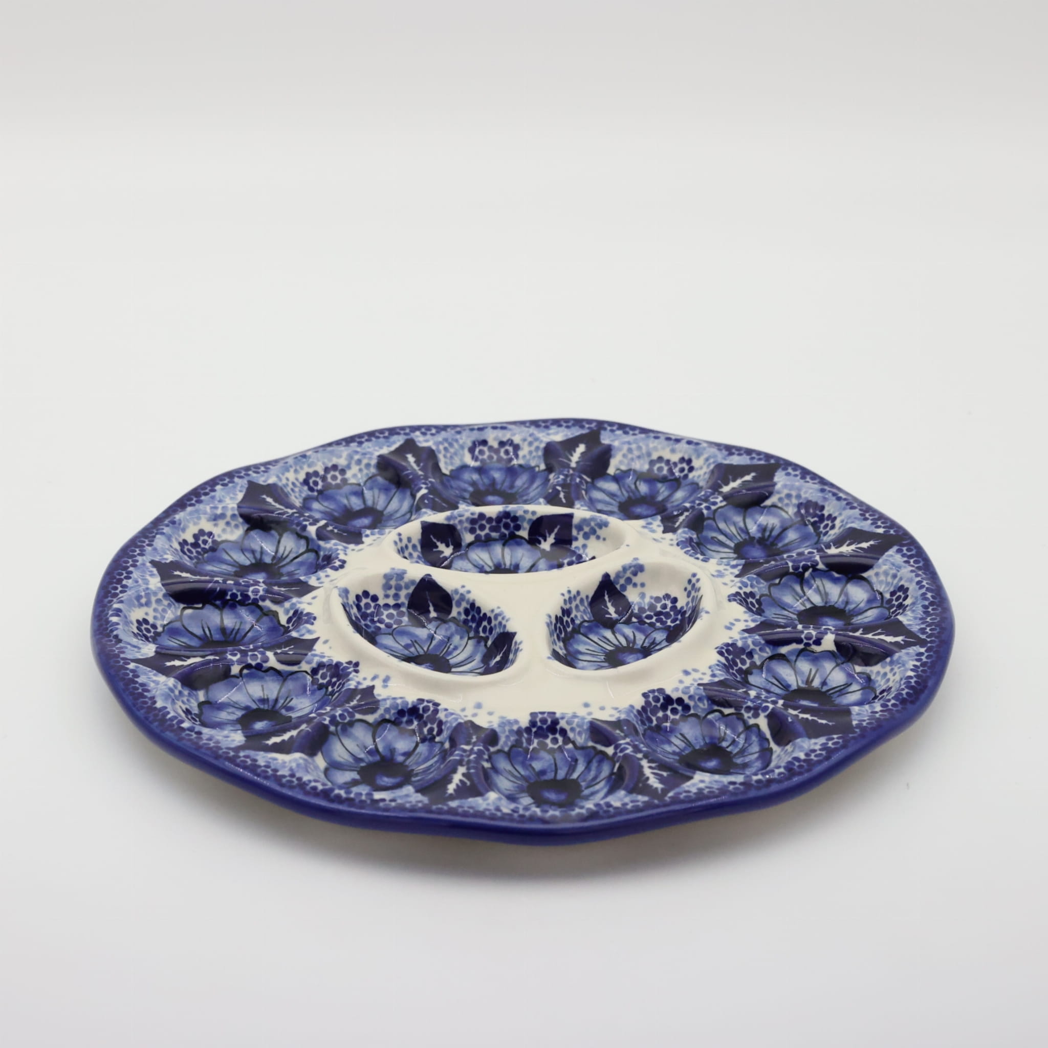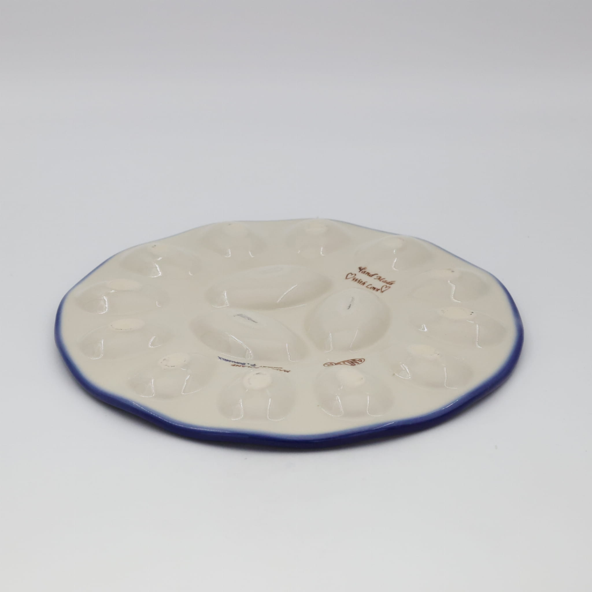 Kolekcja użytkowych talerzy do jaj, oryginalnej ceramiki bolesławieckiej, urzeka kształtami i pięknymi zdobieniami. Ta tacka na jaja jest idealna do serwowania potraw podczas przyjęć świątecznych i nie tylko. Gładka powierzchnia z wytrzymałą powłoką szkliwa, odporna na zmywanie w zmywarkach czy częste użytkowanie. Ceramika bolesławiecka to naczynia codziennego użytku.