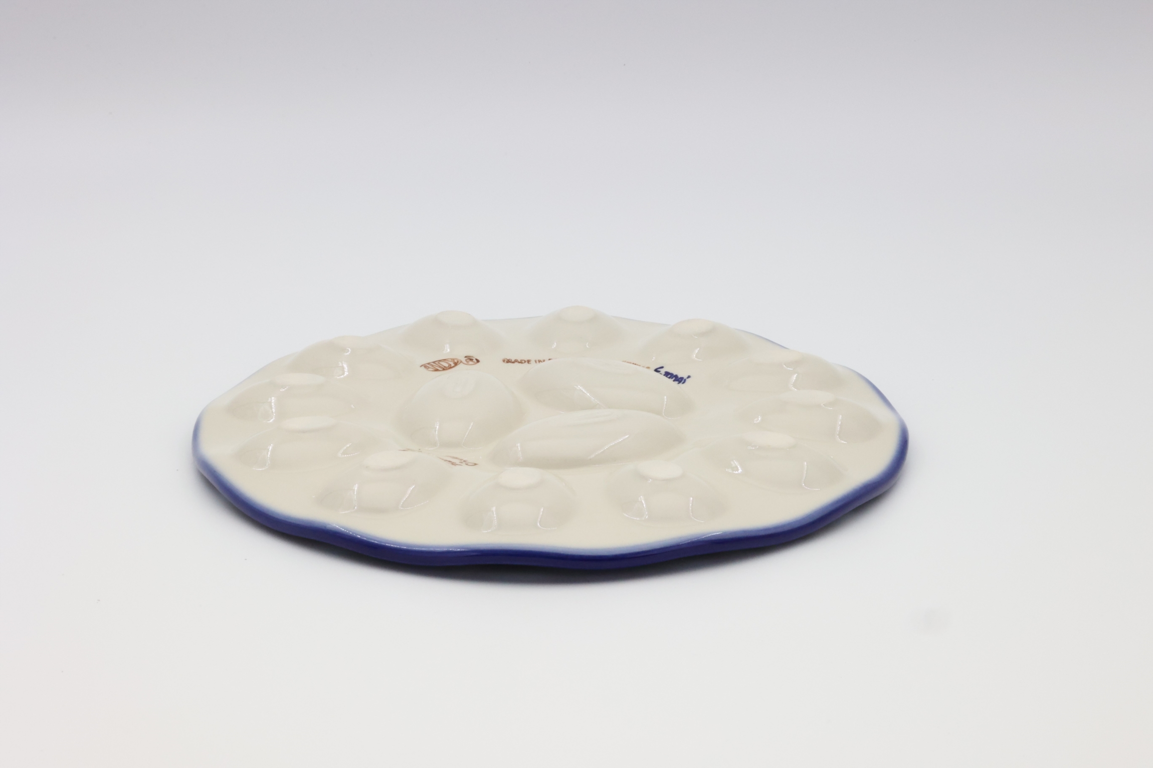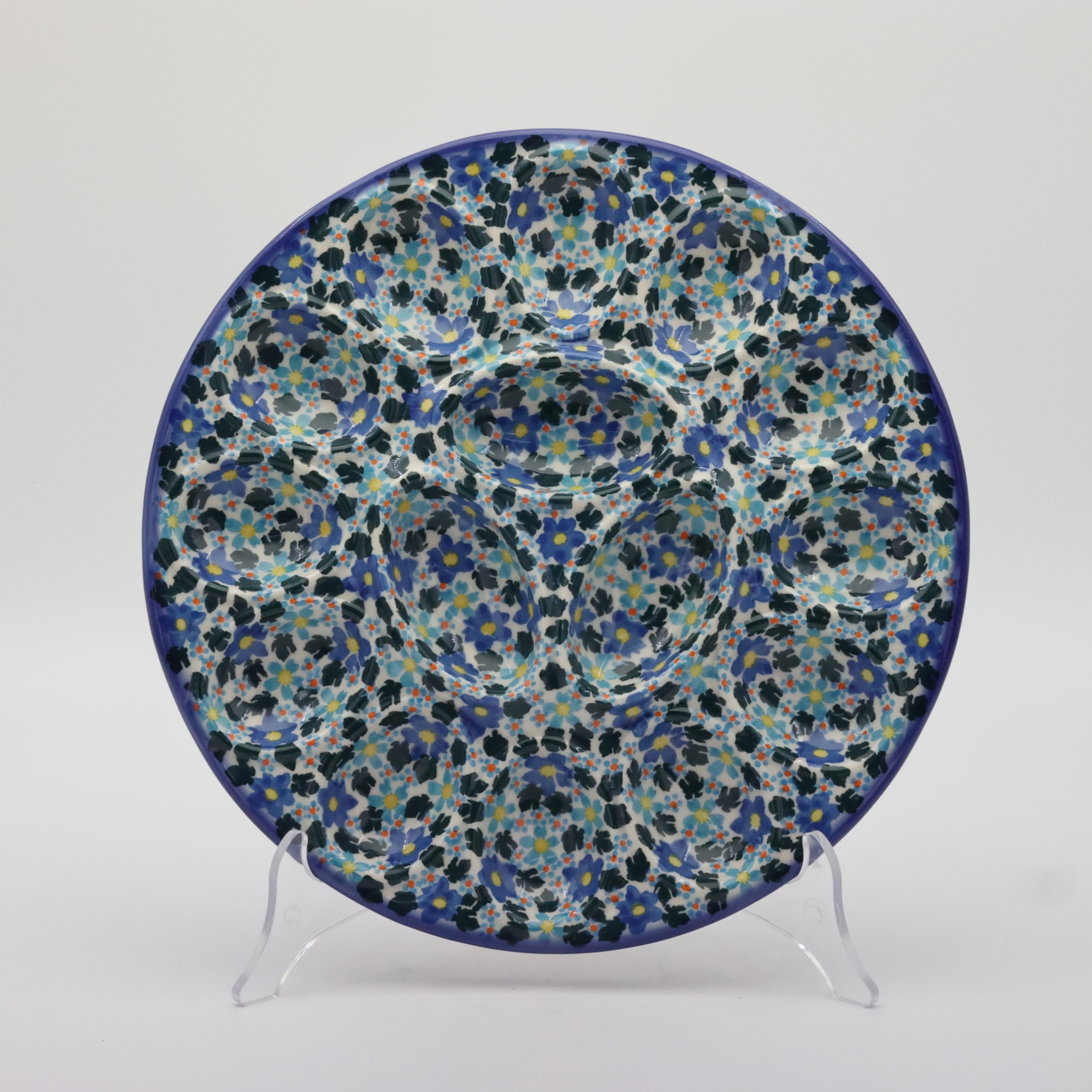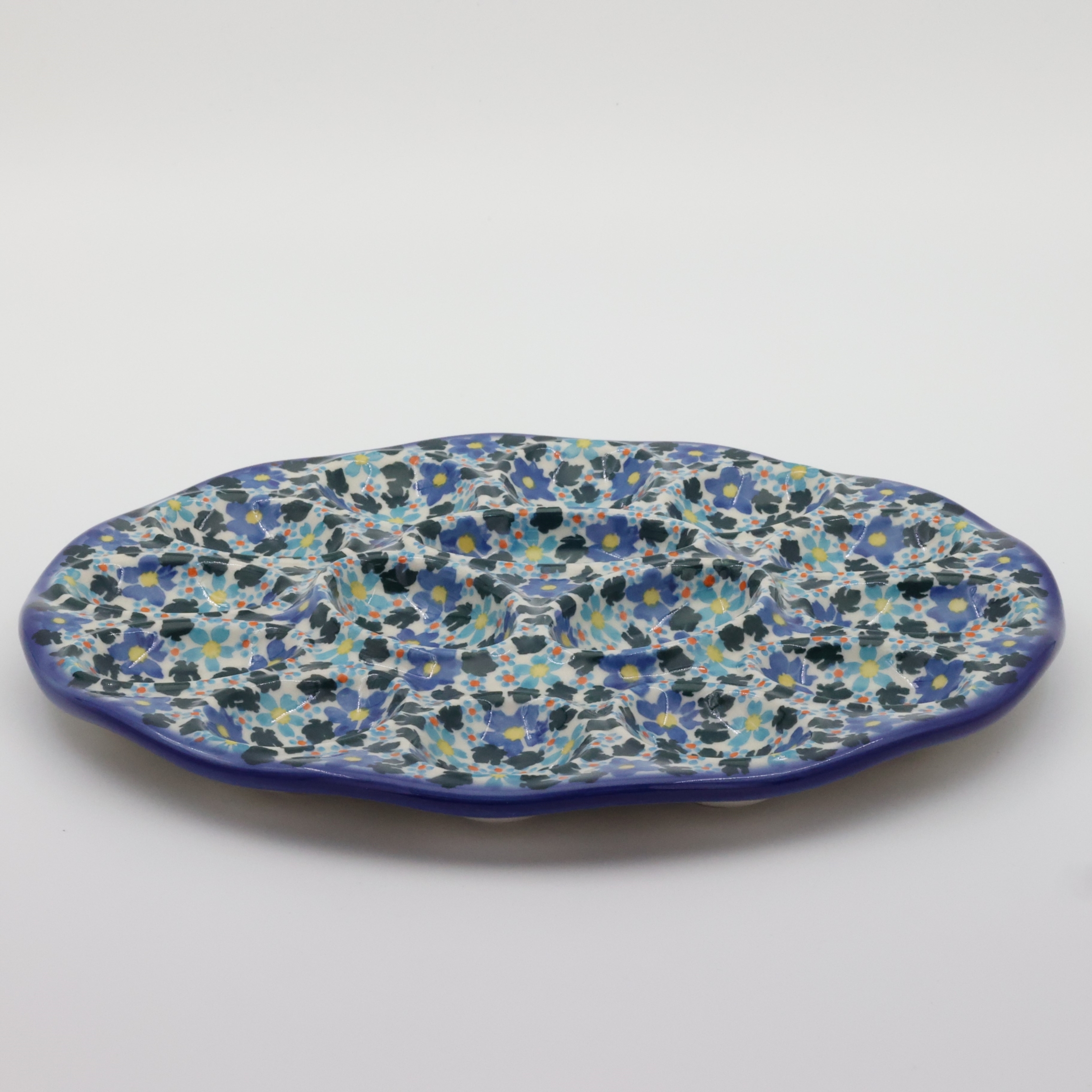 Kolekcja użytkowych talerzy do jaj, oryginalnej ceramiki bolesławieckiej, urzeka kształtami i pięknymi zdobieniami. Ta tacka na jaja jest idealna do serwowania potraw podczas przyjęć świątecznych i nie tylko. Gładka powierzchnia z wytrzymałą powłoką szkliwa, odporna na zmywanie w zmywarkach czy częste użytkowanie. Ceramika bolesławiecka to naczynia codziennego użytku.