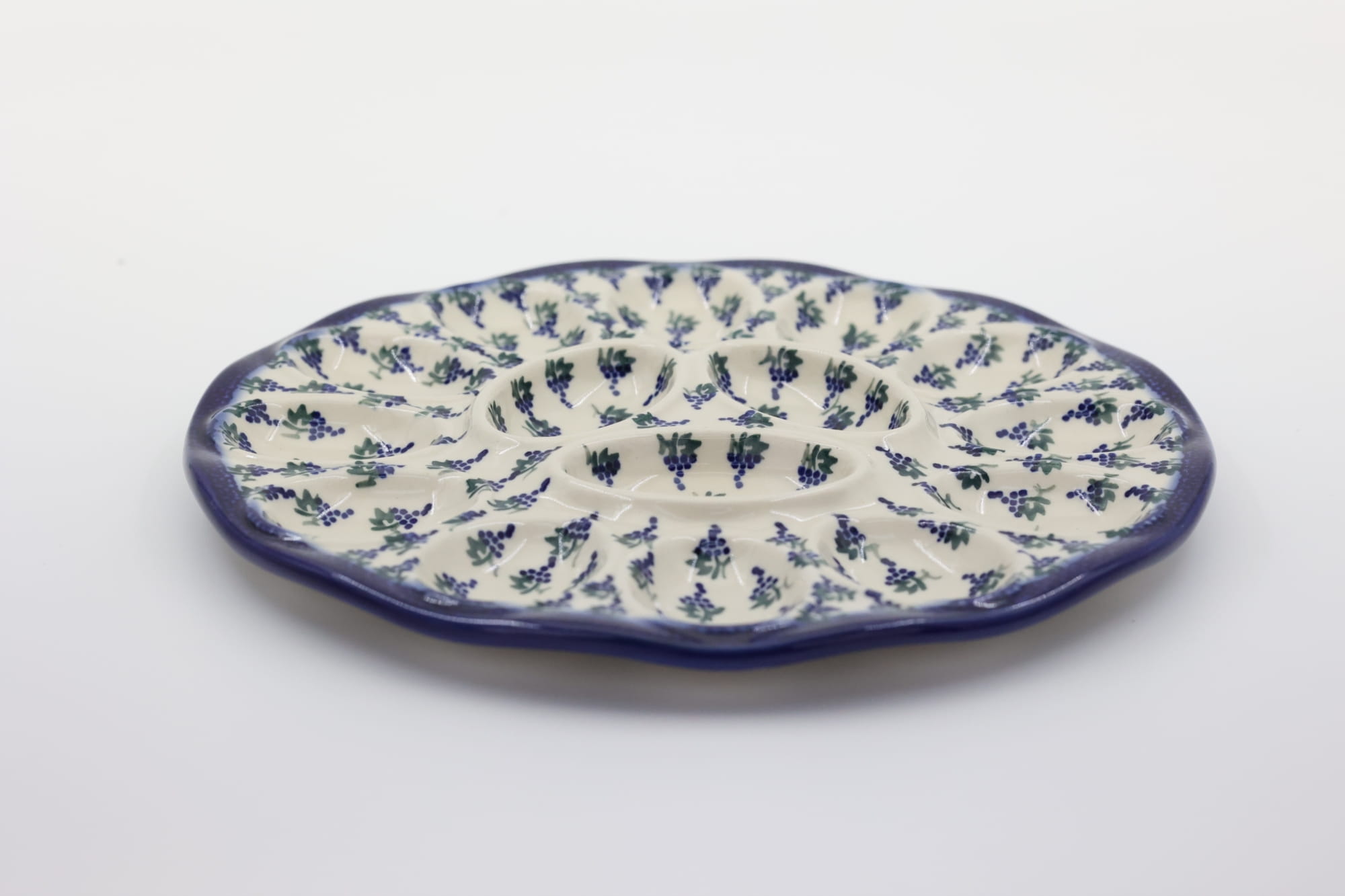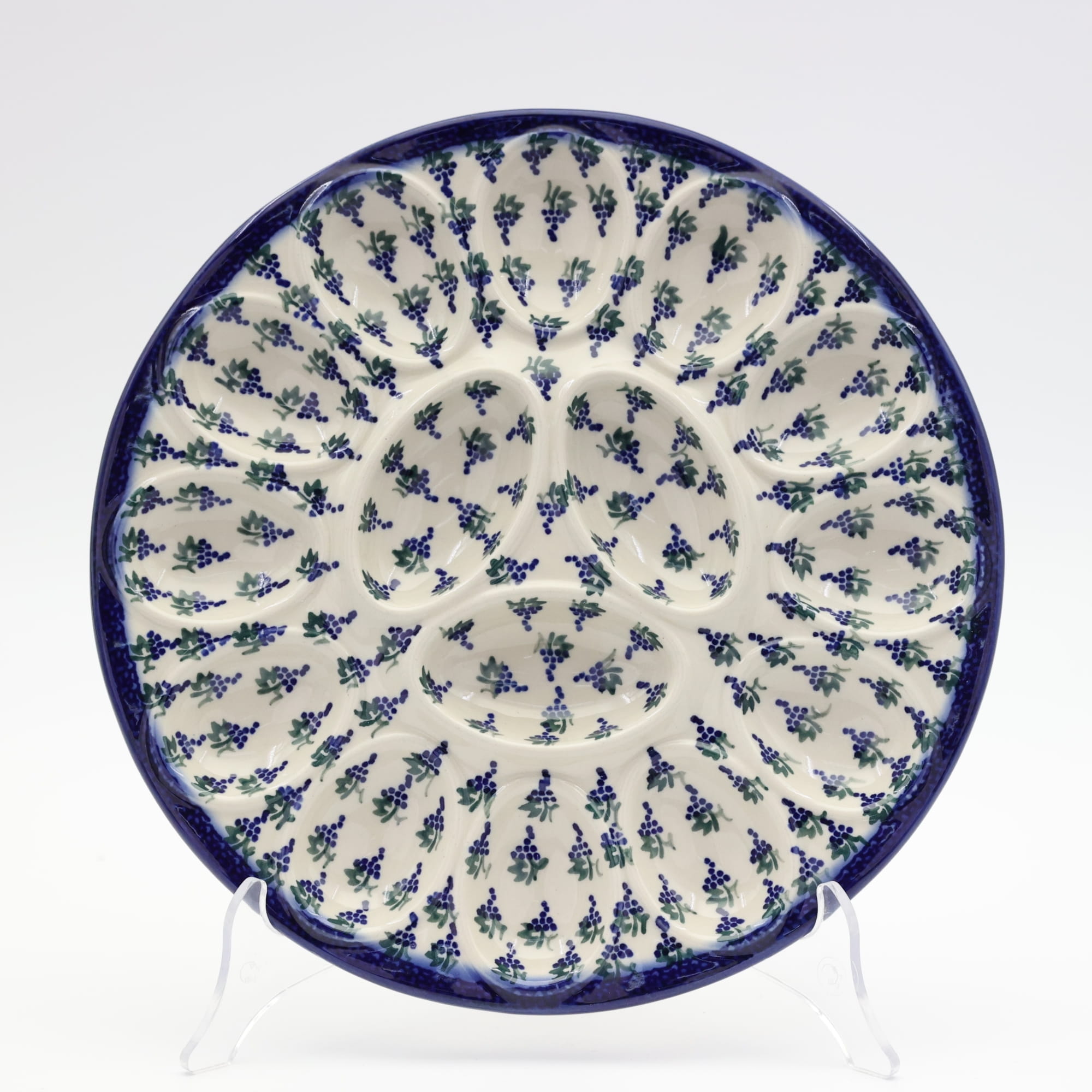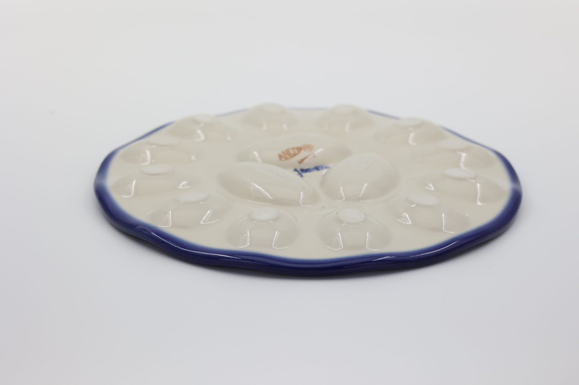Kolekcja użytkowych talerzy do jaj, oryginalnej ceramiki bolesławieckiej, urzeka kształtami i pięknymi zdobieniami. Ta tacka na jaja jest idealna do serwowania potraw podczas przyjęć świątecznych i nie tylko. Gładka powierzchnia z wytrzymałą powłoką szkliwa, odporna na zmywanie w zmywarkach czy częste użytkowanie. Ceramika bolesławiecka to naczynia codziennego użytku.