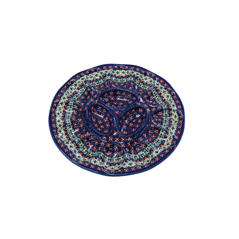 Kolekcja użytkowych talerzy do jaj, oryginalnej ceramiki bolesławieckiej, urzeka kształtami i pięknymi zdobieniami. Ta tacka na jaja jest idealna do serwowania potraw podczas przyjęć świątecznych i nie tylko. Gładka powierzchnia z wytrzymałą powłoką szkliwa, odporna na zmywanie w zmywarkach czy częste użytkowanie. Ceramika bolesławiecka to naczynia codziennego użytku.