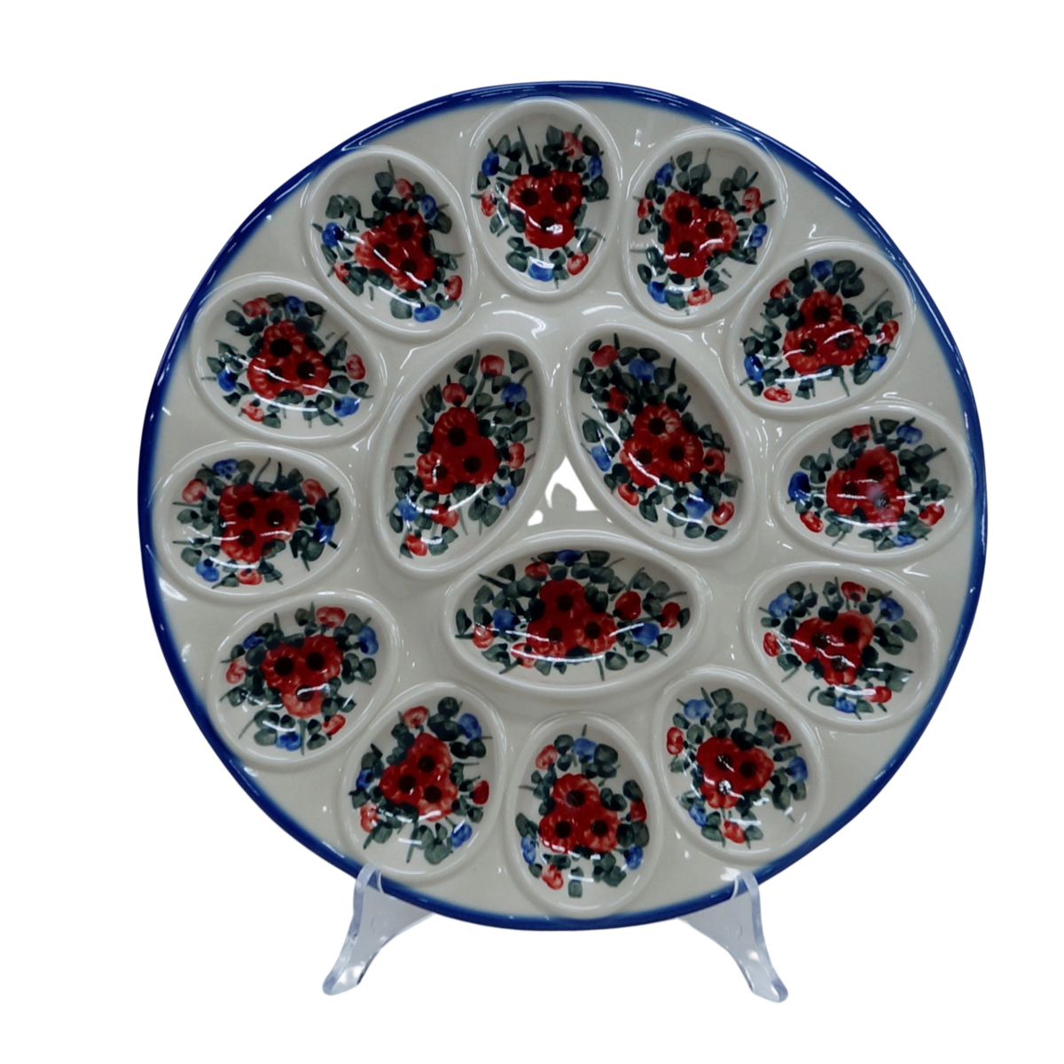 Kolekcja użytkowych talerzy do jaj, oryginalnej ceramiki bolesławieckiej, urzeka kształtami i pięknymi zdobieniami. Ta tacka na jaja jest idealna do serwowania potraw podczas przyjęć świątecznych i nie tylko. Gładka powierzchnia z wytrzymałą powłoką szkliwa, odporna na zmywanie w zmywarkach czy częste użytkowanie. Ceramika bolesławiecka to naczynia codziennego użytku.
