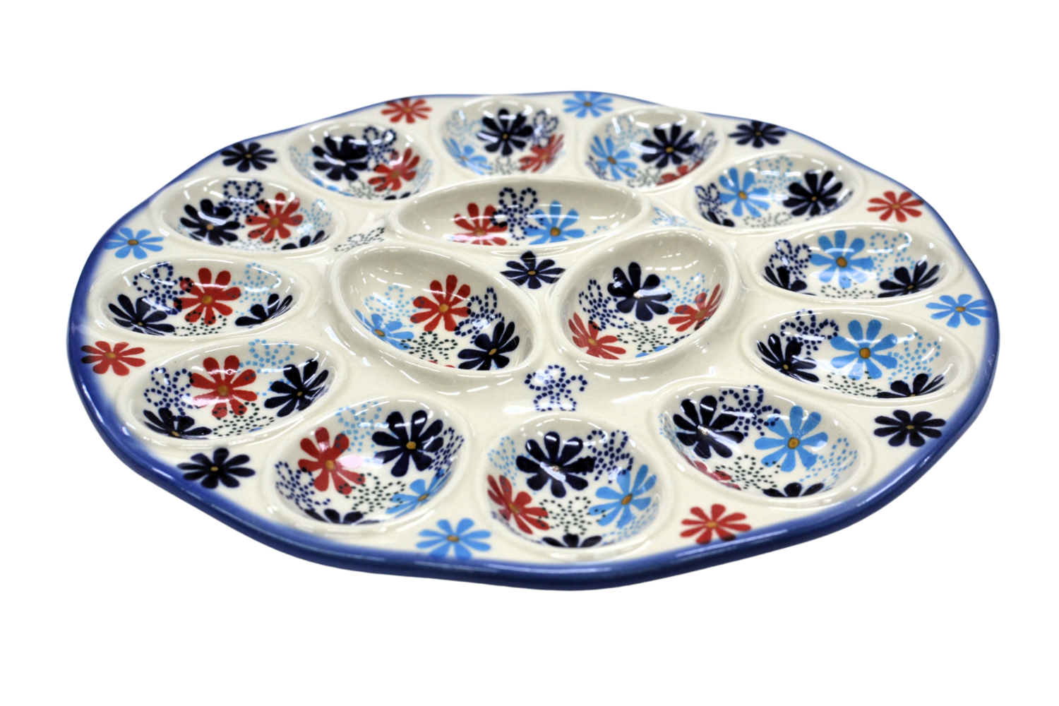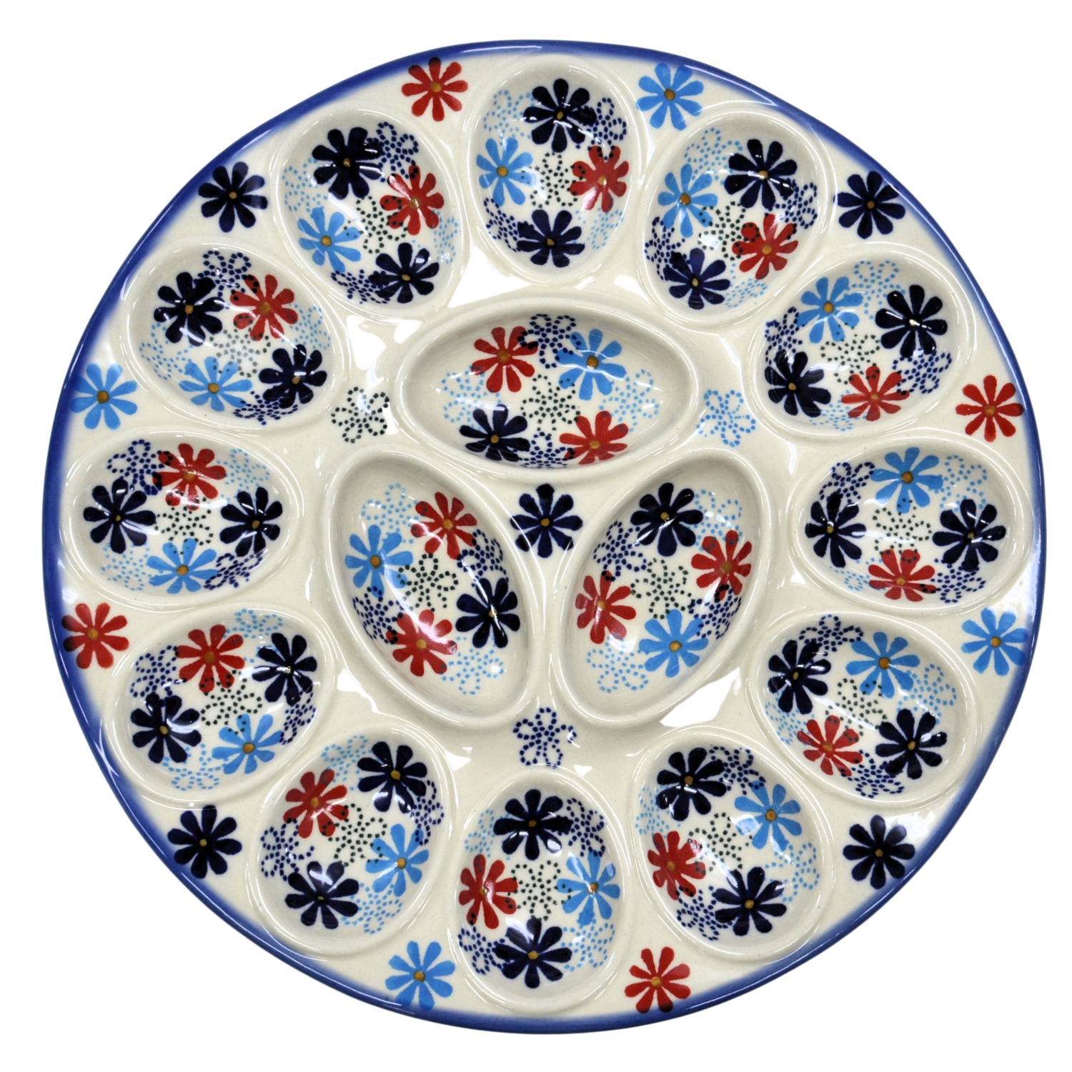 Kolekcja użytkowych talerzy do jaj, oryginalnej ceramiki bolesławieckiej, urzeka kształtami i pięknymi zdobieniami. Ta tacka na jaja jest idealna do serwowania potraw podczas przyjęć świątecznych i nie tylko. Gładka powierzchnia z wytrzymałą powłoką szkliwa, odporna na zmywanie w zmywarkach czy częste użytkowanie. Ceramika bolesławiecka to naczynia codziennego użytku.
