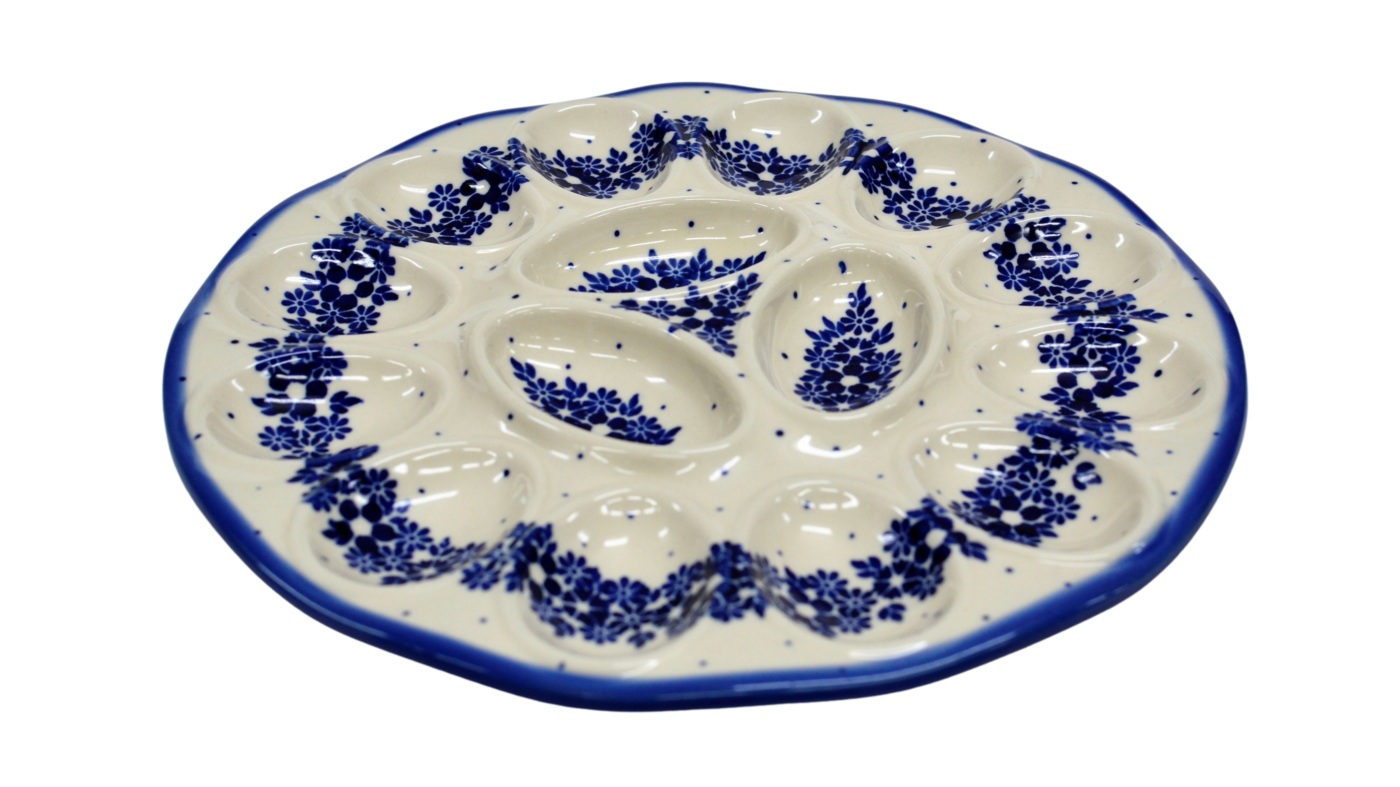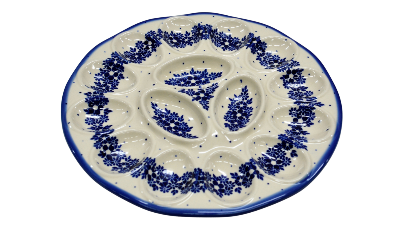 Kolekcja użytkowych talerzy do jaj, oryginalnej ceramiki bolesławieckiej, urzeka kształtami i pięknymi zdobieniami. Ta tacka na jaja jest idealna do serwowania potraw podczas przyjęć świątecznych i nie tylko. Gładka powierzchnia z wytrzymałą powłoką szkliwa, odporna na zmywanie w zmywarkach czy częste użytkowanie. Ceramika bolesławiecka to naczynia codziennego użytku.