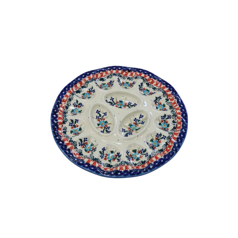 Kolekcja użytkowych talerzy do jaj, oryginalnej ceramiki bolesławieckiej, urzeka kształtami i pięknymi zdobieniami. Ta tacka na jaja jest idealna do serwowania potraw podczas przyjęć świątecznych i nie tylko. Gładka powierzchnia z wytrzymałą powłoką szkliwa, odporna na zmywanie w zmywarkach czy częste użytkowanie. Ceramika bolesławiecka to naczynia codziennego użytku.