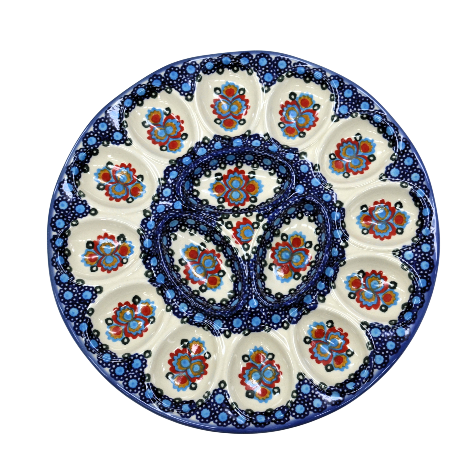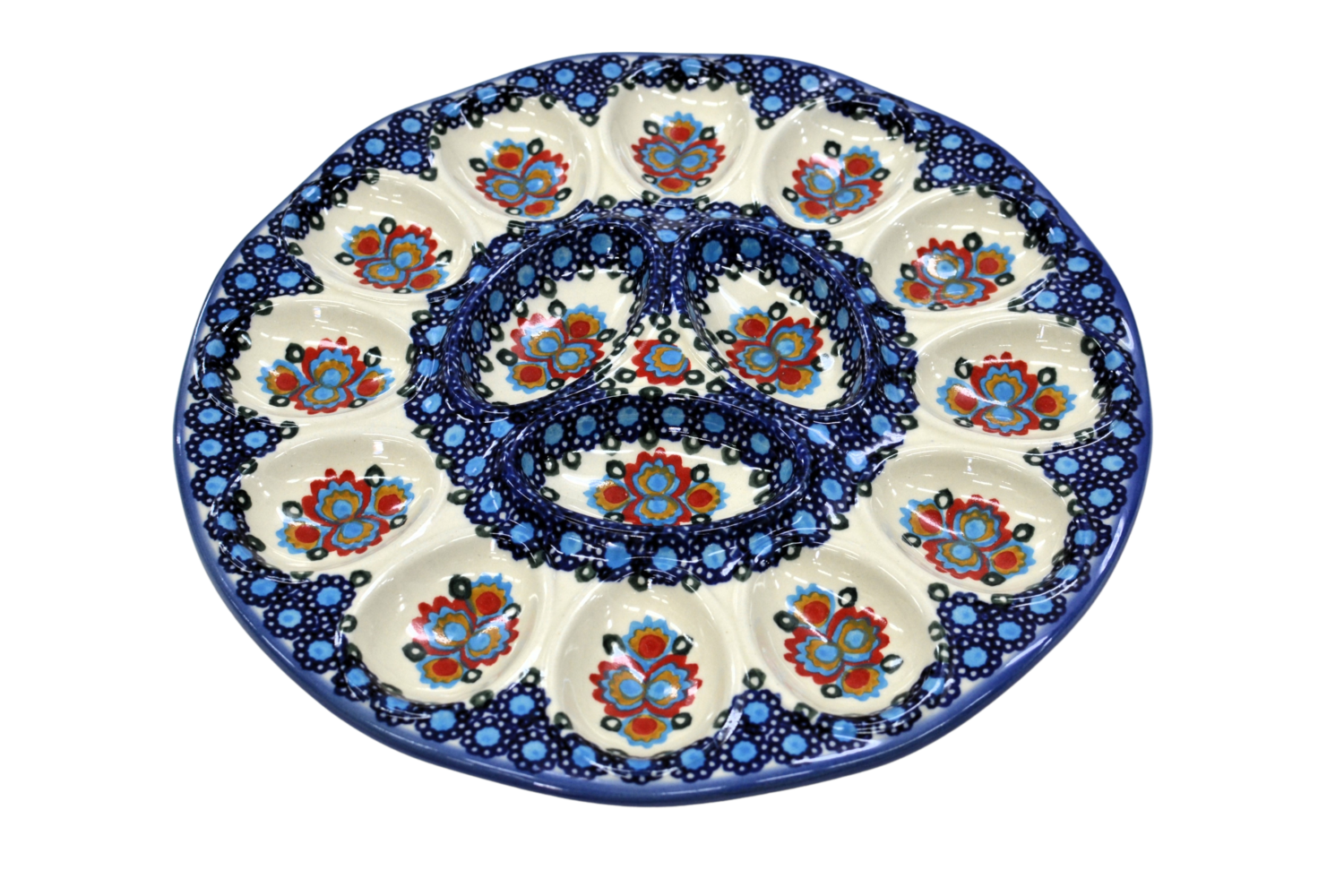 Kolekcja użytkowych talerzy do jaj, oryginalnej ceramiki bolesławieckiej, urzeka kształtami i pięknymi zdobieniami. Ta tacka na jaja jest idealna do serwowania potraw podczas przyjęć świątecznych i nie tylko. Gładka powierzchnia z wytrzymałą powłoką szkliwa, odporna na zmywanie w zmywarkach czy częste użytkowanie. Ceramika bolesławiecka to naczynia codziennego użytku.