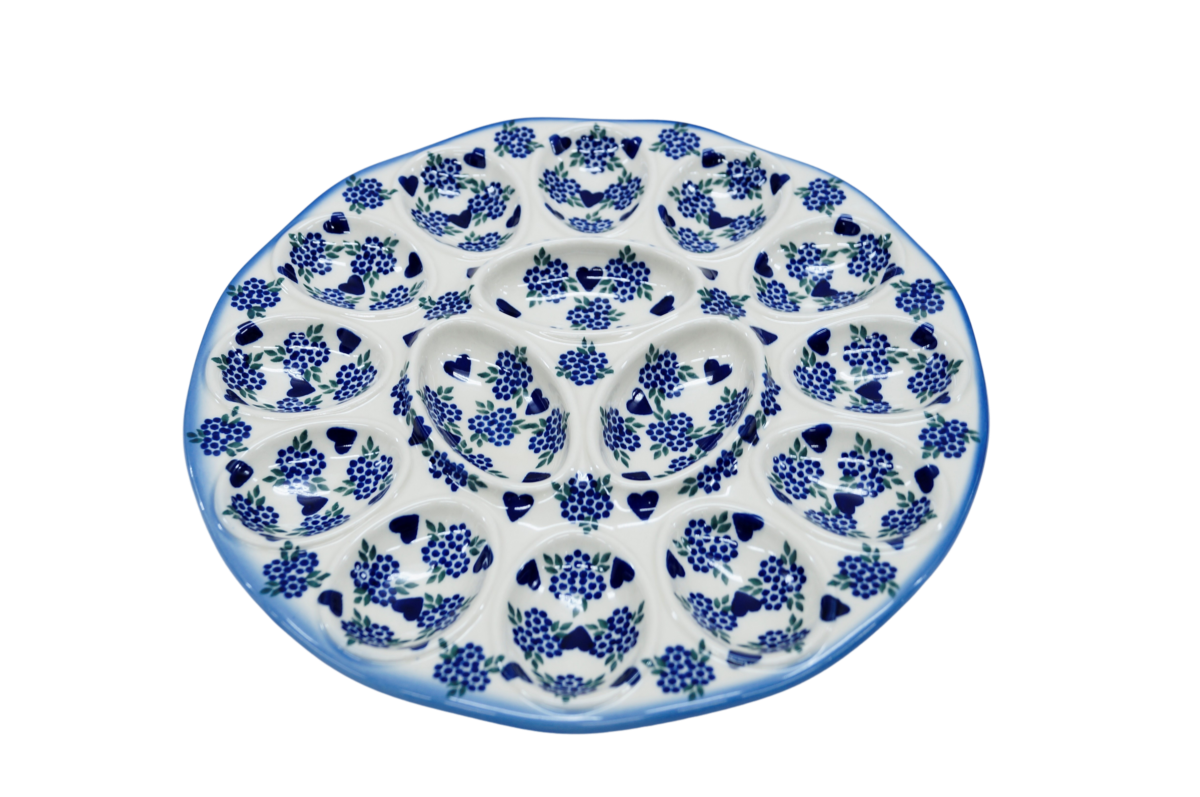 Kolekcja użytkowych talerzy do jaj, oryginalnej ceramiki bolesławieckiej, urzeka kształtami i pięknymi zdobieniami. Ta tacka na jaja jest idealna do serwowania potraw podczas przyjęć świątecznych i nie tylko. Gładka powierzchnia z wytrzymałą powłoką szkliwa, odporna na zmywanie w zmywarkach czy częste użytkowanie. Ceramika bolesławiecka to naczynia codziennego użytku.