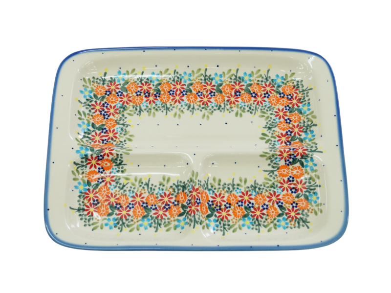 Talerze dzielony obiadowy to wspaniały pomysł na podanie na stół pięknie ułożonych i udekorowanych sałatek, surówek, mięs, ziemniaków, frytek, batatów. Potrawy umieszczone na talerzu mogą zostać ułożone w oryginalny sposób, oddzielone od siebie. Na talerzu można poukładać kolorowe sałatki, mięsa, warzywa. Wyjątkowy stół, oryginalnie podane potrawy, podczas Twojego przyjęcia, dzięki ręcznie wykonanym ceramicznym naczyniom ze zdobieniom podszkliwnym. Piękne, ręcznie dekorowane i glazurowane, talerze ceramiczne zdobione są różnokolorowymi wzorami, zieleń, czerwień, brąz, bolesławiecki kobalt, to to co dodaje wyjątkowej unikatowości i dyskretnej elegancji naczyń ceramicznych. Oryginalny talerz z Bolesławca, miasta ceramiki, niesamowicie wyróżni na stole tradycyjne polskie potrawy i te powstałe na wzór potraw kuchni całego świata.